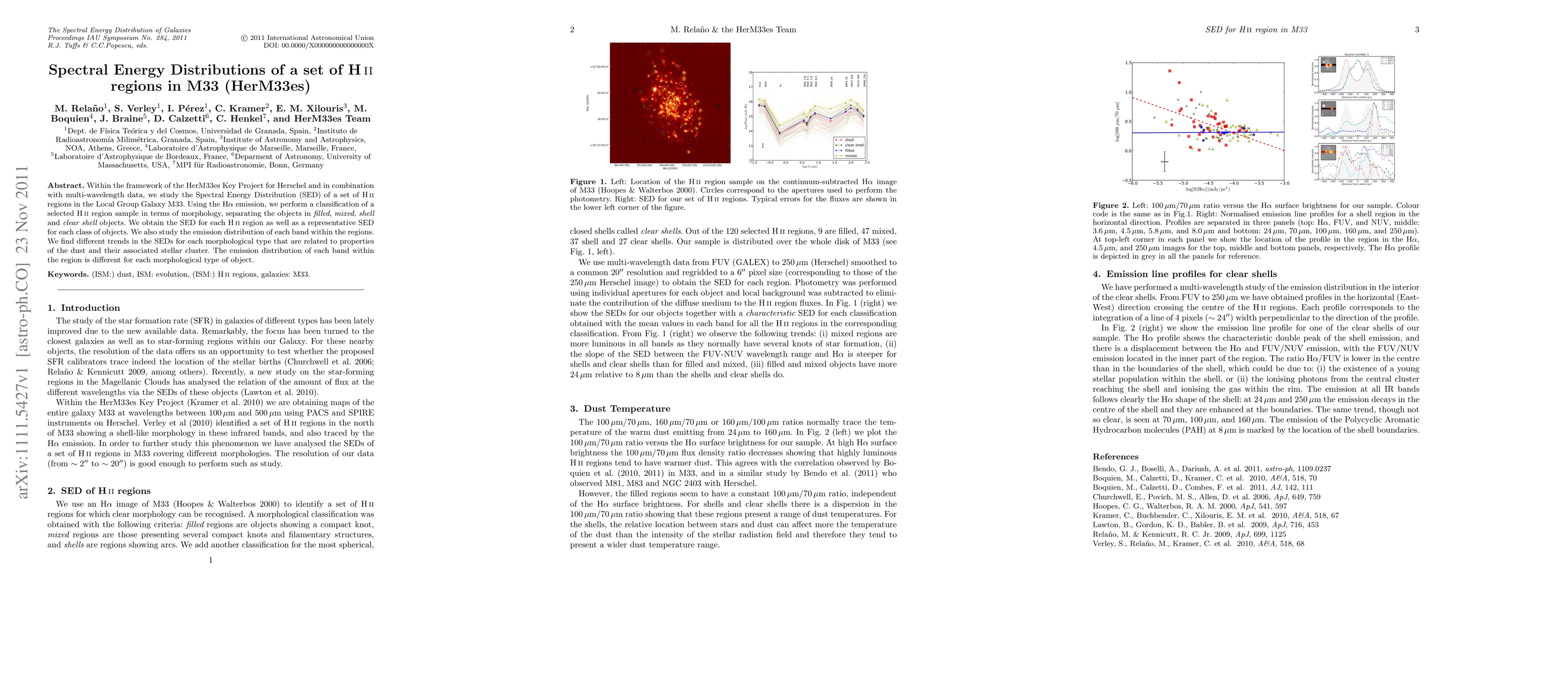 Researchers studied HII regions in M33 galaxy using H-alpha emission, finding different trends in Spectral Energy Distributions for each morphological type, related to dust and stellar cluster properties.