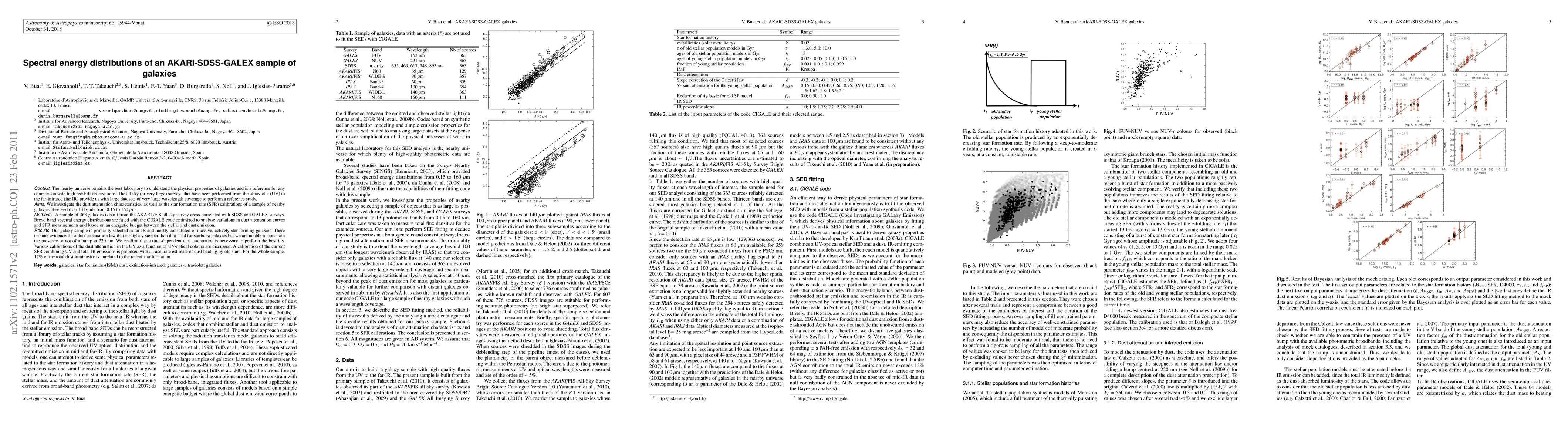 This study investigates dust attenuation and star formation rates in a sample of 363 nearby galaxies observed across 13 bands from UV to far-IR using the AKARI, SDSS, and GALEX surveys. The CIGALE code is used to fit spectral energy distributions, revealing a dust attenuation law slightly steeper than typical starburst galaxies and confirming the necessity of a time-dependent attenuation model. A new calibration for star formation rate combining UV and IR emissions is proposed, with 17% of dust luminosity unrelated to recent star formation.