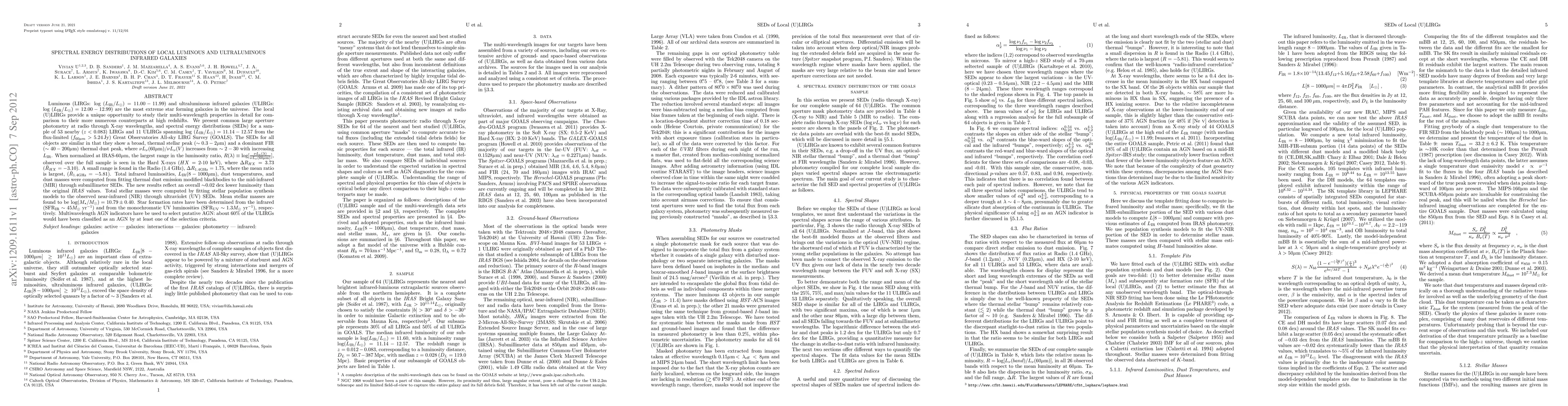 This paper investigates the spectral energy distributions (SEDs) of local luminous and ultraluminous infrared galaxies (LIRGs and ULIRGs), revealing a broad thermal peak and a dominant FIR thermal dust peak. The study finds a significant range in luminosity ratios across different wavelengths, with the largest range observed in Hard X-rays. The research also estimates total infrared luminosities, dust masses, stellar masses, and star formation rates, noting that about 60% of ULIRGs exhibit AGN characteristics.