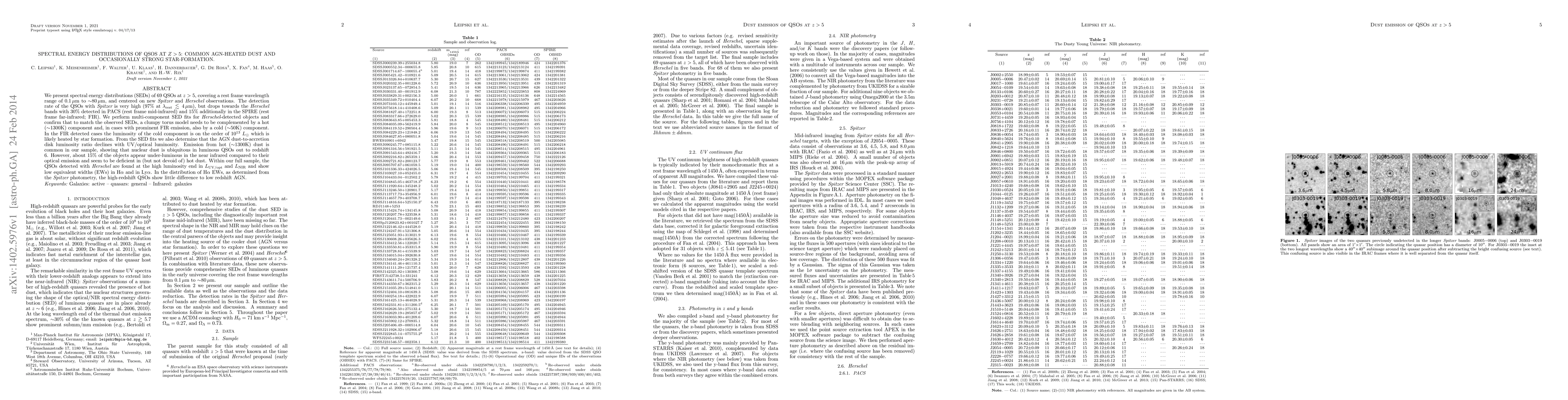 We present spectral energy distributions (SEDs) of 69 QSOs at z>5, covering a rest frame wavelength range of 0.1mu to ~80mu, and centered on new Spitzer and Herschel observations. The detection rate of the QSOs with Spitzer is very high (97% at lambda_rest ~< 4mu), but drops towards the Herschel bands with 30% detected in PACS (rest frame mid-infrared) and 15% additionally in the SPIRE (rest frame far-infrared; FIR). We perform multi-component SED fits for Herschel-detected objects and confirm that to match the observed SEDs, a clumpy torus model needs to be complemented by a hot (~1300K) component and, in cases with prominent FIR emission, also by a cold (~50K) component. In the FIR detected cases the luminosity of the cold component is on the order of 10^13 L_sun which is likely heated by star formation. From the SED fits we also determine that the AGN dust-to-accretion disk luminosity ratio declines with UV/optical luminosity. Emission from hot (~1300K) dust is common in our sample, showing that nuclear dust is ubiquitous in luminous QSOs out to redshift 6. However, about 15% of the objects appear under-luminous in the near infrared compared to their optical emission and seem to be deficient in (but not devoid of) hot dust. Within our full sample, the QSOs detected with Herschel are found at the high luminosity end in L_UV/opt and L_NIR and show low equivalent widths (EWs) in H_alpha and in Ly_alpha. In the distribution of H_alpha EWs, as determined from the Spitzer photometry, the high-redshift QSOs show little difference to low redshift AGN.