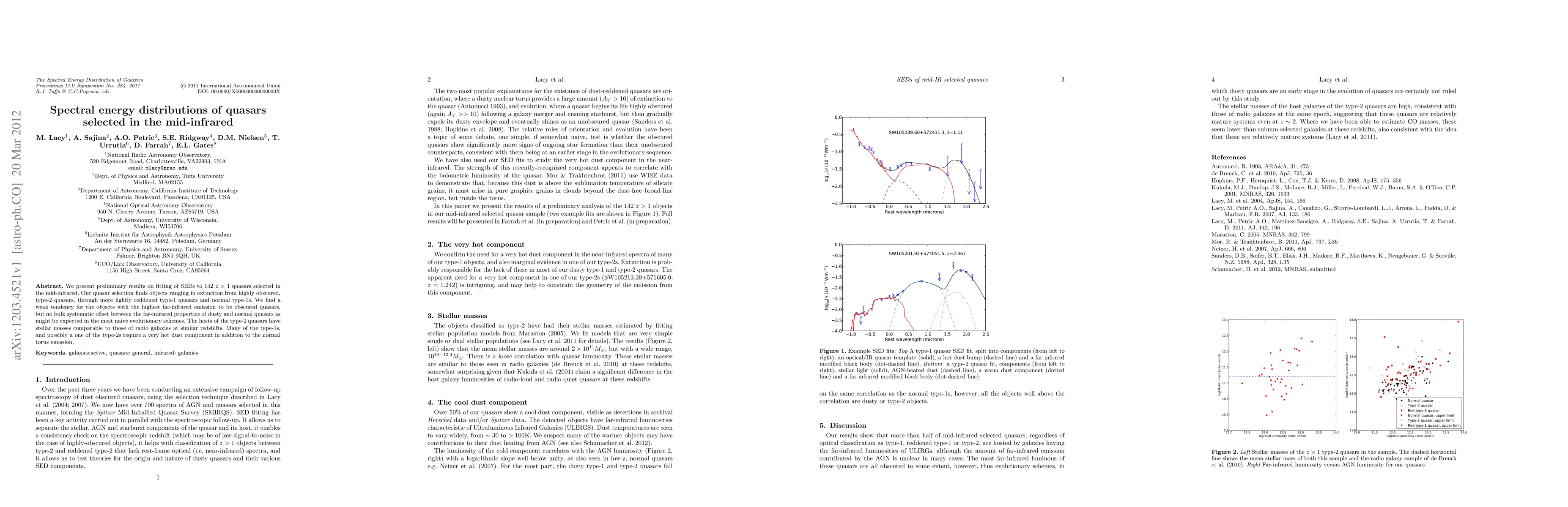 This paper presents preliminary results on spectral energy distribution (SED) fits for 142 mid-infrared selected quasars, revealing a weak correlation between high far-infrared emission and obscured quasars, with no significant systematic offset in far-infrared properties between dusty and normal quasars. Type-2 quasars have stellar masses similar to those of radio galaxies, and some type-1 quasars require additional very hot dust components.