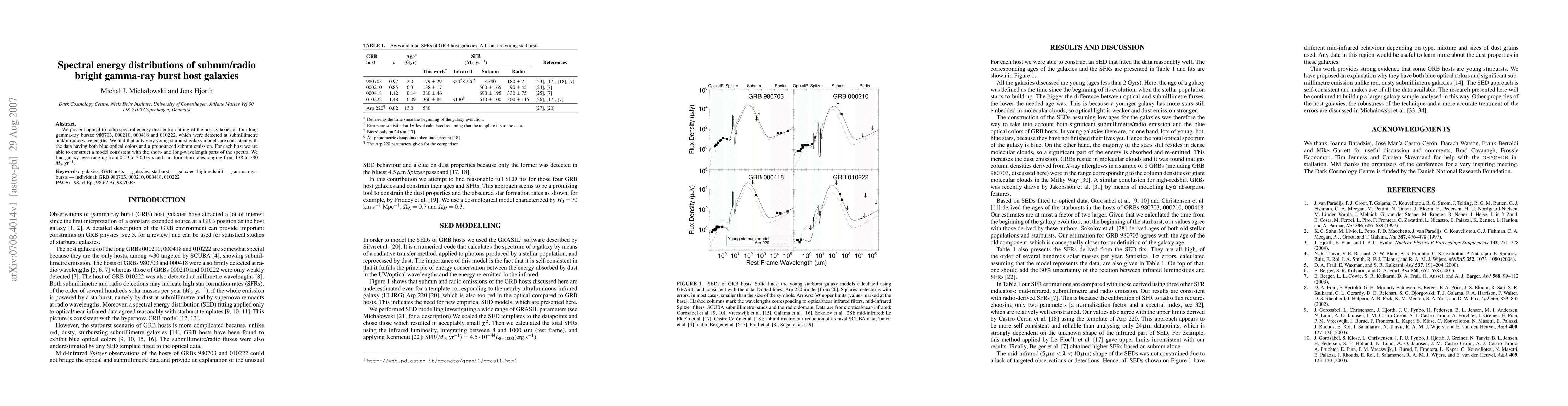 We present optical to radio spectral energy distribution fitting of the host galaxies of four long gamma-ray bursts: 980703, 000210, 000418 and 010222, which were detected at submillimetre and/or radio wavelengths. We find that only very young starburst galaxy models are consistent with the data having both blue optical colors and a pronounced submm emission. For each host we are able to construct a model consistent with the short- and long-wavelength parts of the spectra. We find galaxy ages ranging from 0.09 to 2.0 Gyrs and star formation rates ranging from 138 to 380 MSun/yr.