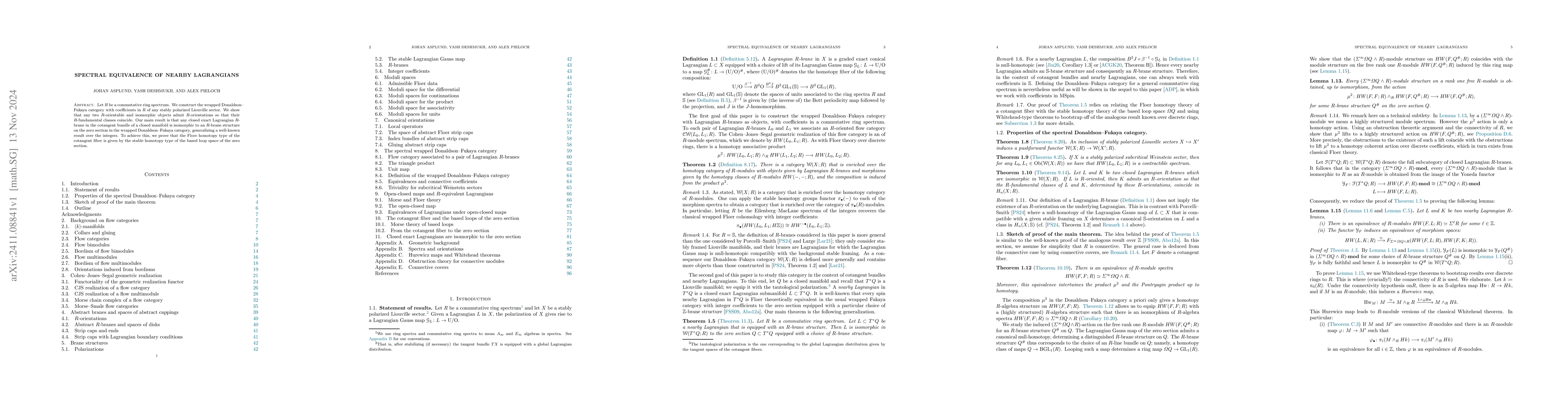 This paper constructs the wrapped Donaldson--Fukaya category over a commutative ring spectrum $R$ and proves that nearby exact Lagrangians in the cotangent bundle of a closed manifold are isomorphic to $R$-brane structures on the zero section, establishing spectral equivalence. It also shows that $R$-orientations of isomorphic objects yield coinciding $R$-fundamental classes.