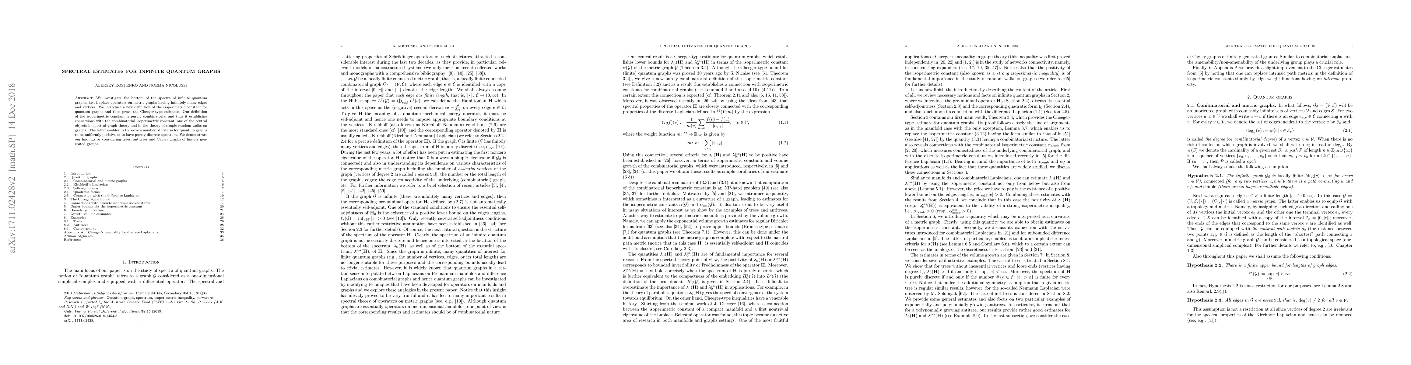 This paper explores the spectral properties of infinite quantum graphs, introducing a combinatorial isoperimetric constant to derive Cheeger-type estimates. It establishes criteria for the graphs to be uniformly positive or to have purely discrete spectra, illustrated through examples like trees, antitrees, and Cayley graphs.