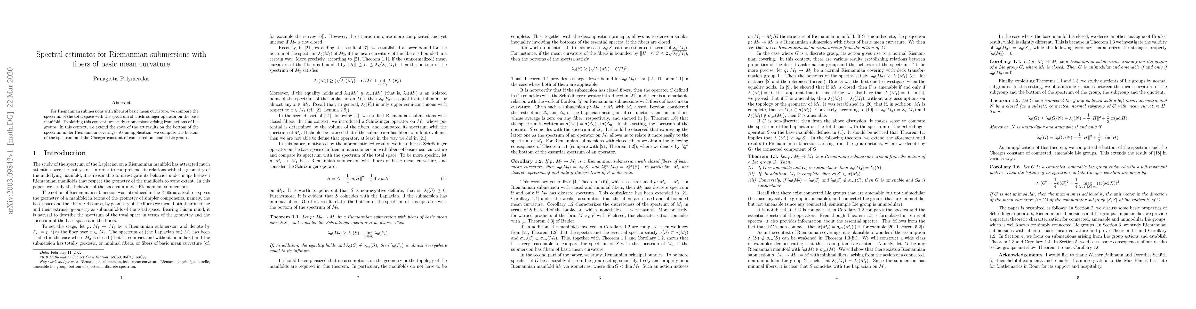 For Riemannian submersions with fibers of basic mean curvature, we compare the spectrum of the total space with the spectrum of a Schr\"{o}dinger operator on the base manifold. Exploiting this concept, we study submersions arising from actions of Lie groups. In this context, we extend the state of the art results on the bottom of the spectrum under Riemannian coverings. As an application, we compute the bottom of the spectrum and the Cheeger constant of connected, amenable Lie groups.
