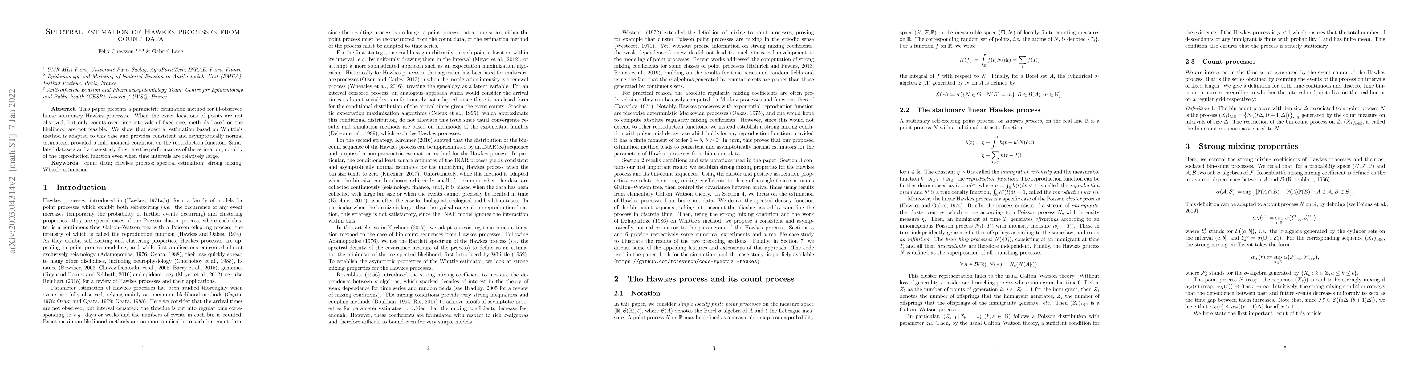 This research introduces a spectral estimation method for linear stationary Hawkes processes using Whittle's approach when only count data over fixed time intervals is available. The method provides consistent and asymptotically normal estimators, demonstrated through simulations and a case study, even with larger time intervals.