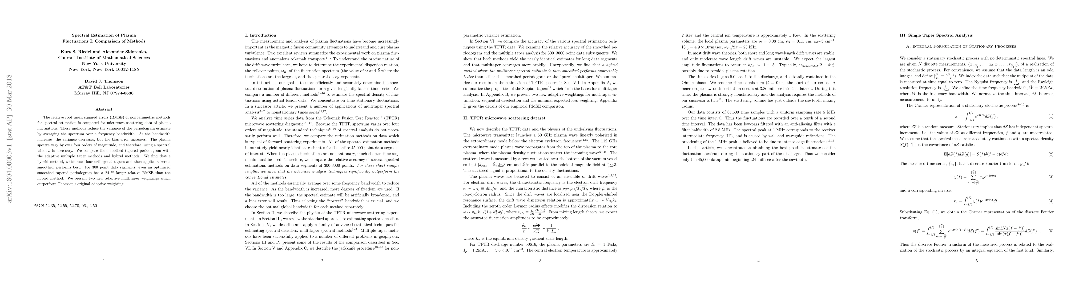This paper compares various nonparametric methods for estimating the spectrum of plasma fluctuations, finding that a hybrid method using four orthogonal tapers and a kernel smoother outperforms others, including the smoothed tapered periodogram. The study also introduces two new adaptive multi-taper weightings that surpass Thomson's original adaptive weighting.