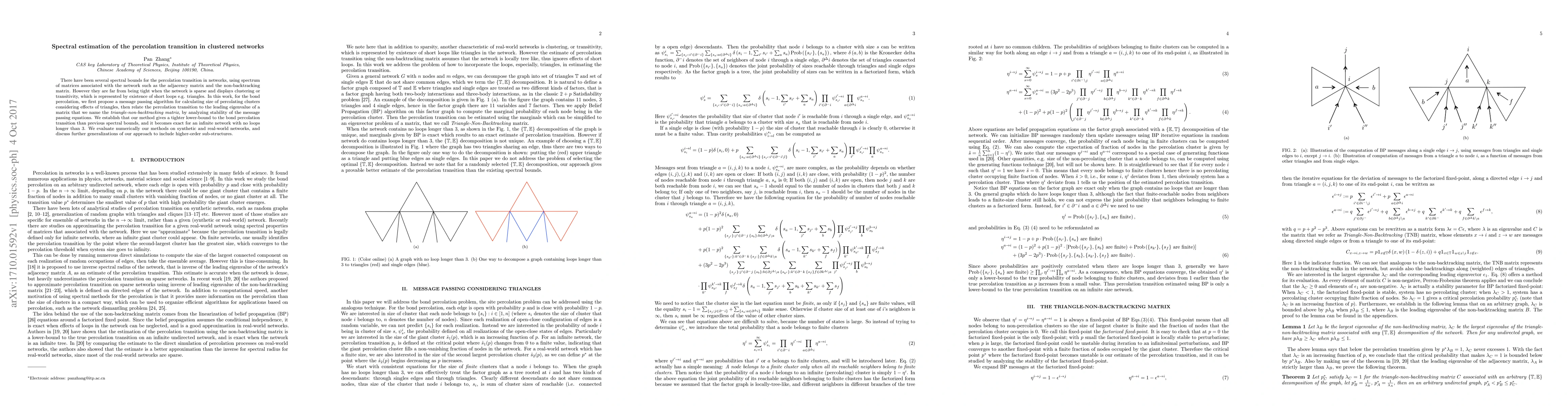 Researchers developed a new method to estimate the percolation transition in clustered networks, providing a tighter lower bound than previous spectral bounds. Their approach uses a message passing algorithm and a triangle-non-backtracking matrix, offering insights into the effects of short loops on network behavior.