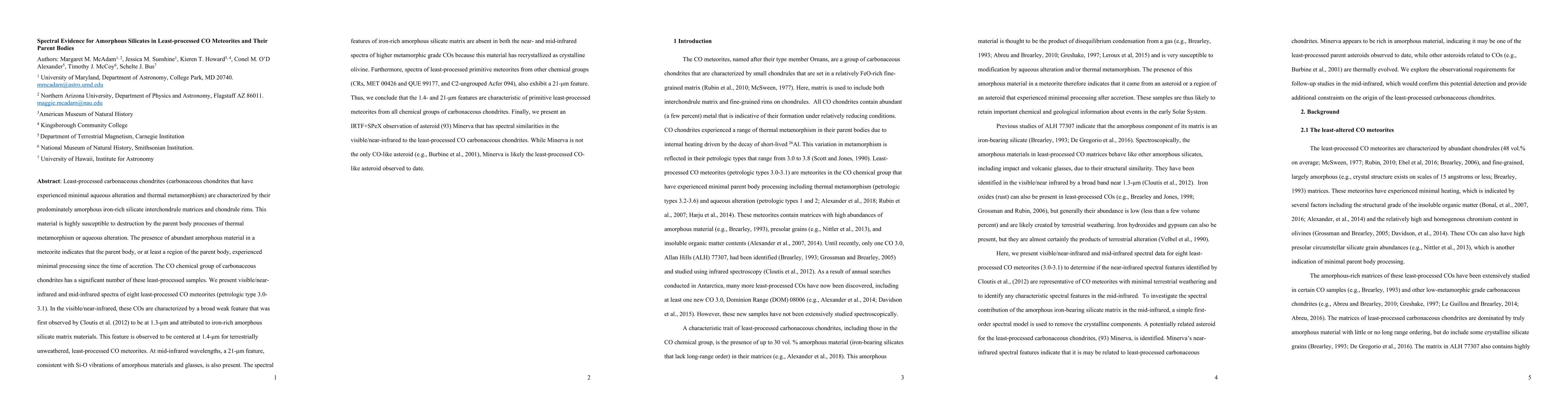 This study identifies spectral features at 1.4-um and 21-um in least-processed CO carbonaceous chondrites, indicative of amorphous silicates, suggesting minimal processing since accretion. These spectral signatures are also found in other primitive meteorites and asteroid (93) Minerva, indicating a common origin for these least-processed bodies.