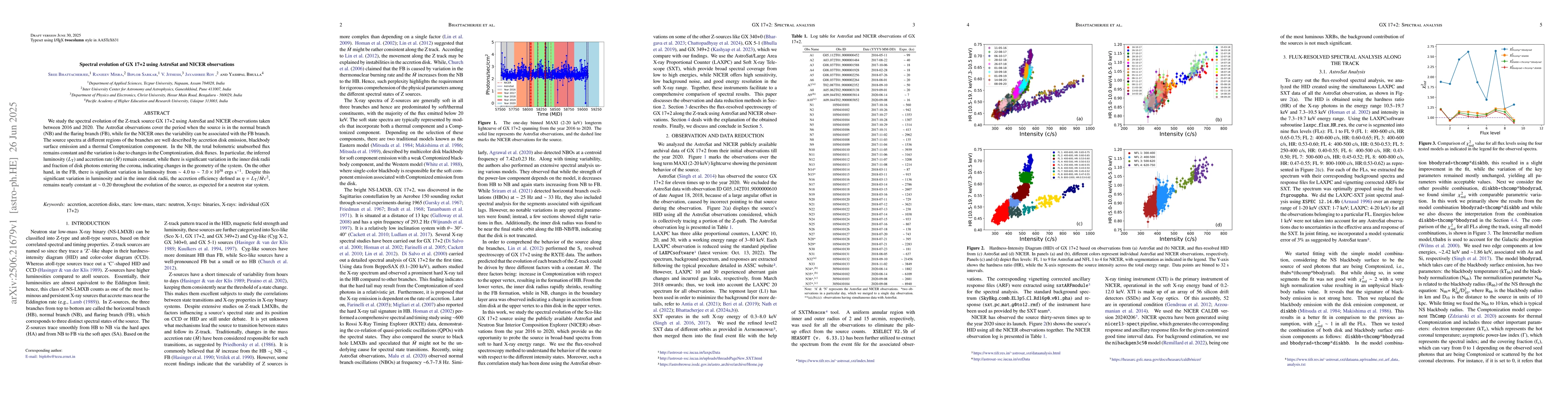 We study the spectral evolution of the Z-track source GX 17+2 using AstroSat and NICER observations taken between 2016 and 2020. The AstroSat observations cover the period when the source is in the normal branch (NB) and the flaring branch (FB), while for the NICER ones the variability can be associated with the FB branch. The source spectra at different regions of the branches are well described by accretion disk emission, blackbody surface emission and a thermal Comptonization component. In the NB, the total bolometric unabsorbed flux remains constant and the variation is due to changes in the Comptonization, disk fluxes. In particular, the inferred luminosity ($L_{\rm T}$) and accretion rate ($\dot M$) remain constant, while there is significant variation in the inner disk radii and fraction of disk photons entering the corona, indicating changes in the geometry of the system. On the other hand, in the FB, there is significant variation in luminosity from $\sim 4.0$ to $\sim 7.0 \times 10^{38}$ ergs s$^{-1}$. Despite this significant variation in luminosity and in the inner disk radii, the accretion efficiency defined as $\eta = L_{\rm T}/{\dot M} c^2$, remains nearly constant at $\sim 0.20$ throughout the evolution of the source, as expected for a neutron star system.