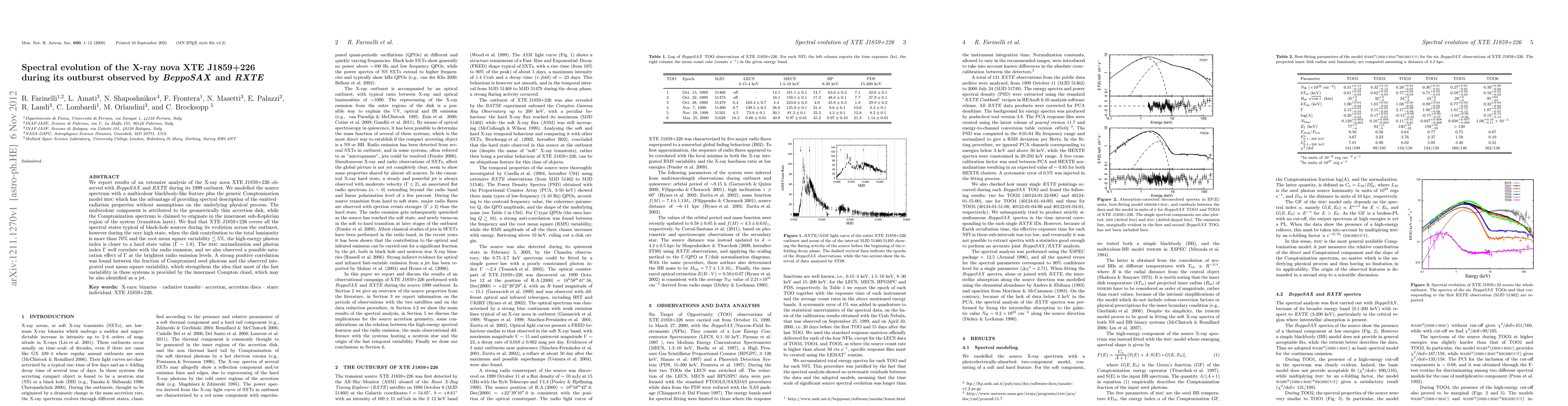 The research analyzes the X-ray nova XTE J1859+226's spectral evolution during its 1999 outburst using BeppoSAX and RXTE data. It models the source spectrum with a multi-colour disk component and a Comptonization model, identifying various spectral states typical of black-hole sources. Key findings include a hard-state-like high-energy photon index during the very high state, correlation between BMC normalization, photon index, and radio emission, and a strong positive correlation between the fraction of Comptonized seed photons and root mean square variability, suggesting fast variability originates from the innermost Compton cloud, potentially a jet.