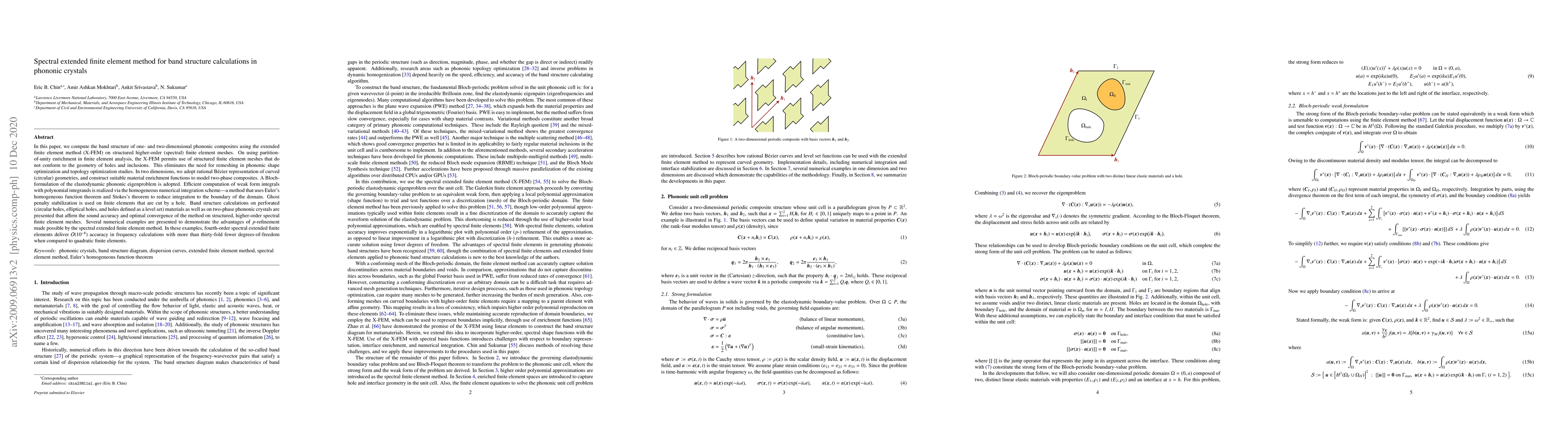 In this paper, we compute the band structure of one- and two-dimensional phononic composites using the extended finite element method (X-FEM) on structured higher-order (spectral) finite element meshes. On using partition-of-unity enrichment in finite element analysis, the X-FEM permits use of structured finite element meshes that do not conform to the geometry of holes and inclusions. This eliminates the need for remeshing in phononic shape optimization and topology optimization studies. In two dimensions, we adopt rational B{\'e}zier representation of curved (circular) geometries, and construct suitable material enrichment functions to model two-phase composites. A Bloch-formulation of the elastodynamic phononic eigenproblem is adopted. Efficient computation of weak form integrals with polynomial integrands is realized via the homogeneous numerical integration scheme -- a method that uses Euler's homogeneous function theorem and Stokes's theorem to reduce integration to the boundary of the domain. Ghost penalty stabilization is used on finite elements that are cut by a hole. Band structure calculations on perforated (circular holes, elliptical holes, and holes defined as a level set) materials as well as on two-phase phononic crystals are presented that affirm the sound accuracy and optimal convergence of the method on structured, higher-order spectral finite element meshes. Several numerical examples demonstrate the advantages of $p$-refinement made possible by the spectral extended finite element method. In these examples, fourth-order spectral extended finite elements deliver $\mathcal{O}(10^{-8})$ accuracy in frequency calculations with more than thirty-fold fewer degrees-of-freedom when compared to quadratic finite elements.