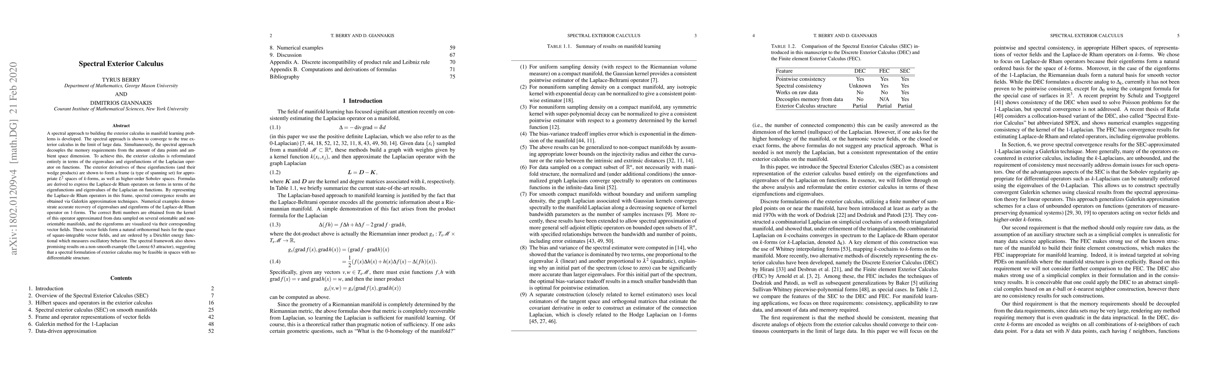 This paper develops a spectral approach to constructing the exterior calculus for manifold learning, showing convergence to true calculus with large data. It leverages the Laplacian operator's eigenvalues and eigenfunctions to decouple memory from data size and dimension, providing accurate recovery of Laplace-de Rham operator eigenvalues and eigenforms, and demonstrating applicability to non-smooth spaces.