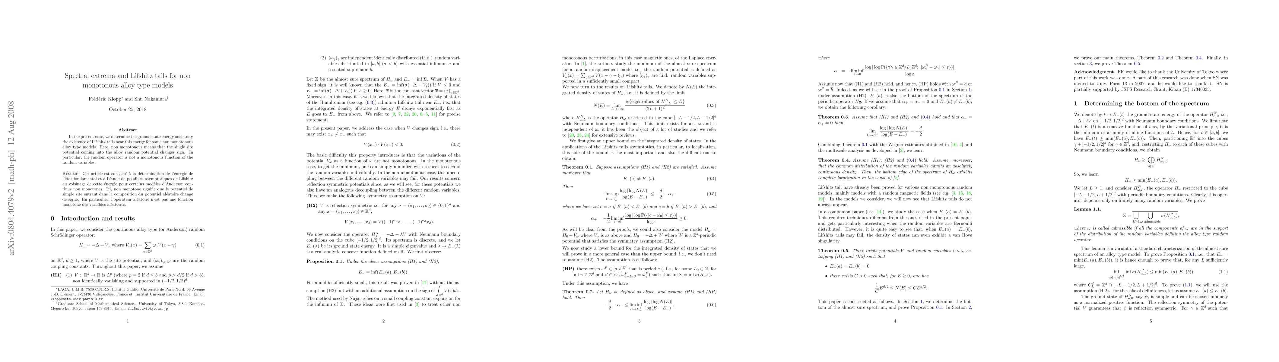 In the present note, we determine the ground state energy and study the existence of Lifshitz tails near this energy for some non monotonous alloy type models. Here, non monotonous means that the single site potential coming into the alloy random potential changes sign. In particular, the random operator is not a monotonous function of the random variables.