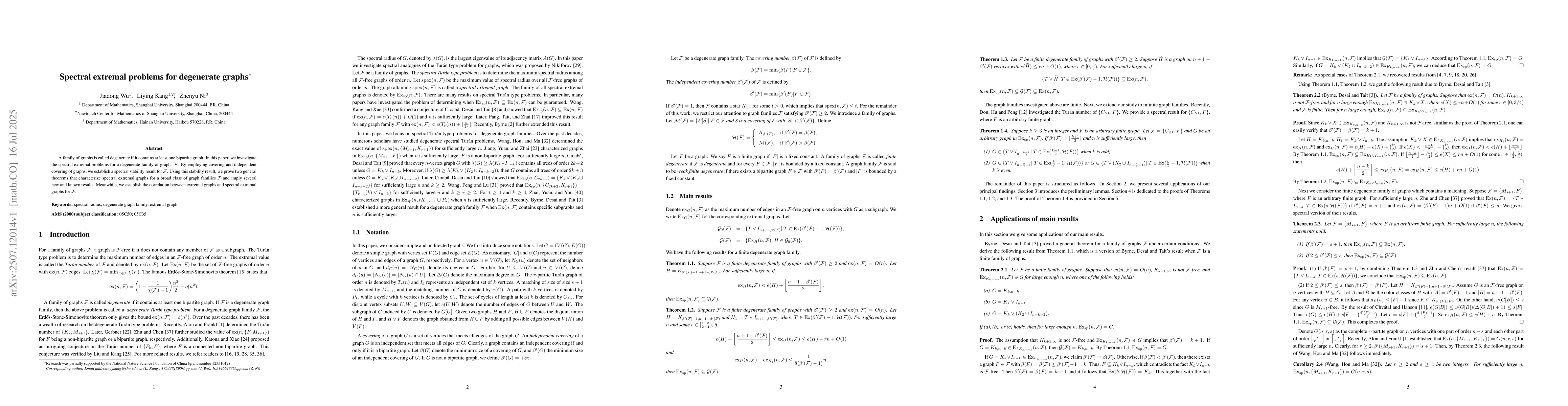A family of graphs is called degenerate if it contains at least one bipartite graph. In this paper, we investigate the spectral extremal problems for a degenerate family of graphs $\mathcal{F}$. By employing covering and independent covering of graphs, we establish a spectral stability result for $\mathcal{F}$. Using this stability result, we prove two general theorems that characterize spectral extremal graphs for a broad class of graph families $\mathcal{F}$ and imply several new and known results. Meanwhile, we establish the correlation between extremal graphs and spectral extremal graphs for $\mathcal{F}$.