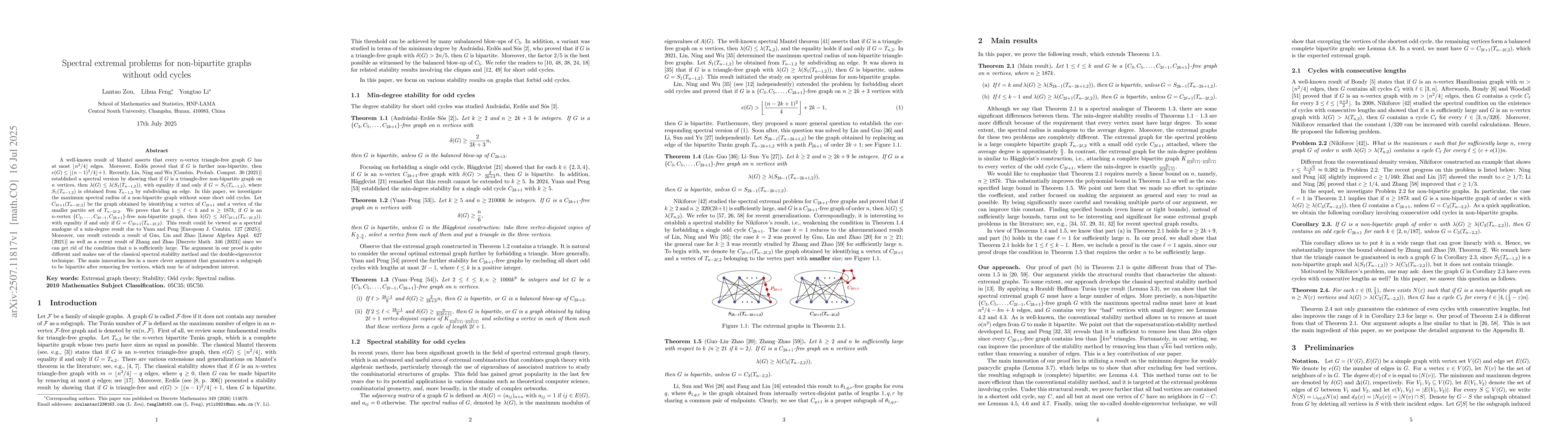 A well-known result of Mantel asserts that every $n$-vertex triangle-free graph $G$ has at most $\lfloor n^2/4 \rfloor$ edges. Moreover, Erd\H{o}s proved that if $G$ is further non-bipartite, then $e(G)\le \lfloor {(n-1)^2}/{4}\rfloor +1$. Recently, Lin, Ning and Wu [Combin. Probab. Comput. 30 (2021)] established a spectral version by showing that if $G$ is a triangle-free non-bipartite graph on $n$ vertices, then $\lambda (G)\le \lambda (S_1(T_{n-1,2}))$, with equality if and only if $G=S_1(T_{n-1,2})$, where $S_1(T_{n-1,2})$ is obtained from $T_{n-1,2}$ by subdividing an edge. In this paper, we investigate the maximum spectral radius of a non-bipartite graph without some short odd cycles. Let $C_{2\ell +1}(T_{n-2\ell, 2})$ be the graph obtained by identifying a vertex of $C_{2\ell+1}$ and a vertex of the smaller partite set of $T_{n-2\ell ,2}$. We prove that for $1\le \ell < k$ and $n\ge 187k$, if $G$ is an $n$-vertex $\{C_3,\ldots ,C_{2\ell -1},C_{2k+1}\}$-free non-bipartite graph, then $\lambda (G)\le \lambda (C_{2\ell +1}(T_{n-2\ell, 2}))$, with equality if and only if $G=C_{2\ell +1}(T_{n-2\ell, 2})$. This result could be viewed as a spectral analogue of a min-degree result due to Yuan and Peng [European J. Combin. 127 (2025)]. Moreover, our result extends a result of Guo, Lin and Zhao [Linear Algebra Appl. 627 (2021)] as well as a recent result of Zhang and Zhao [Discrete Math. 346 (2023)] since we can get rid of the condition that $n$ is sufficiently large. The argument in our proof is quite different and makes use of the classical spectral stability method and the double-eigenvector technique. The main innovation lies in a more clever argument that guarantees a subgraph to be bipartite after removing few vertices, which may be of independent interest.