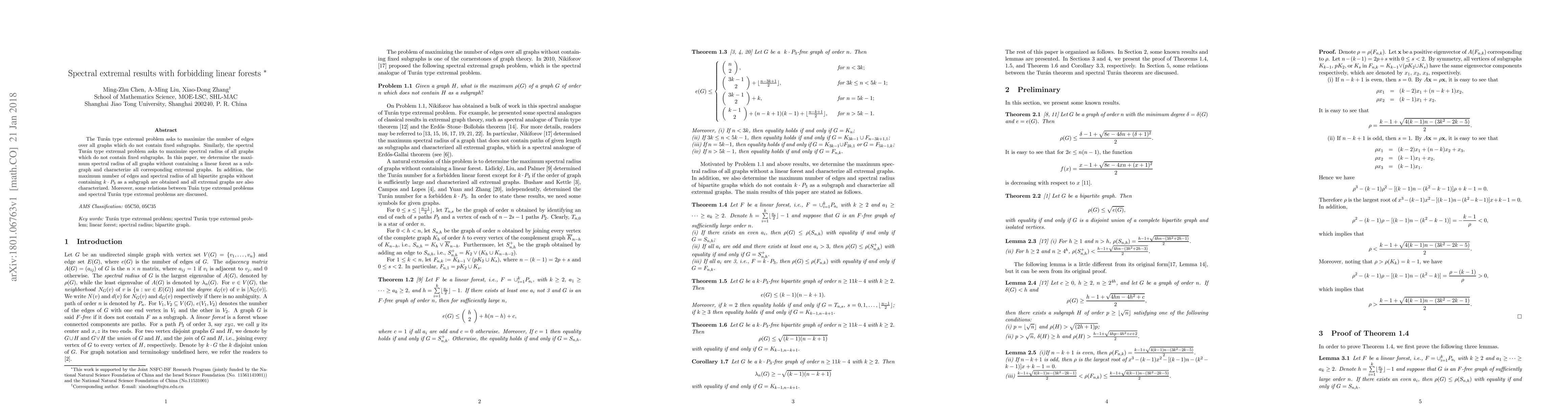The Tur\'an type extremal problem asks to maximize the number of edges over all graphs which do not contain fixed subgraphs. Similarly, the spectral Tur\'an type extremal problem asks to maximize spectral radius of all graphs which do not contain fixed subgraphs. In this paper, we determine the maximum spectral radius of all graphs without containing a linear forest as a subgraph and characterize all corresponding extremal graphs. In addition, the maximum number of edges and spectral radius of all bipartite graphs without containing $k\cdot P_3$ as a subgraph are obtained and all extremal graphs are also characterized. Moreover, some relations between Tu\'an type extremal problems and spectral Tur\'an type extremal problems are discussed.