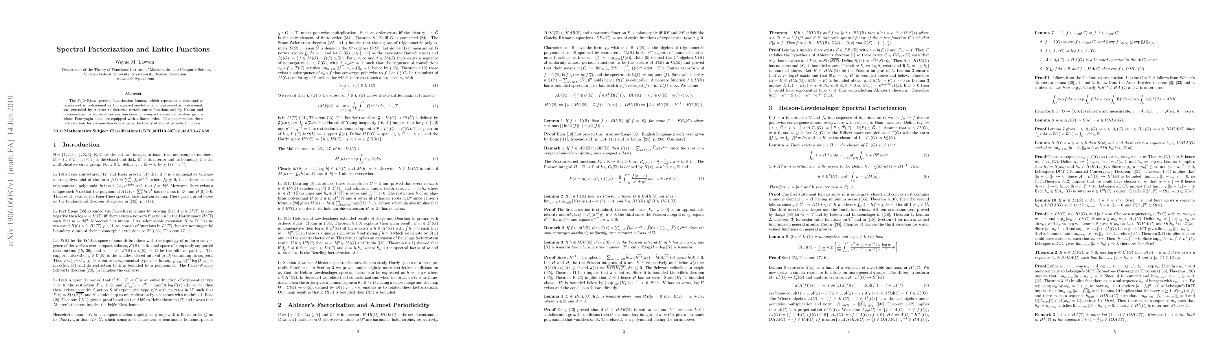 The Fej\'{e}r-Riesz spectral factorization lemma, which represents a nonnegative trigonometric polynomial as the squared modulus of a trigonometric polynomial, was extended by Ahiezer to factorize certain entire functions and by Helson and Lowdenslager to factorize certain functions on compact connected abelian groups whose Pontryagin duals are equipped with a linear order. This paper relates these factorizations for archimedian orders using the theory of almost periodic functions.