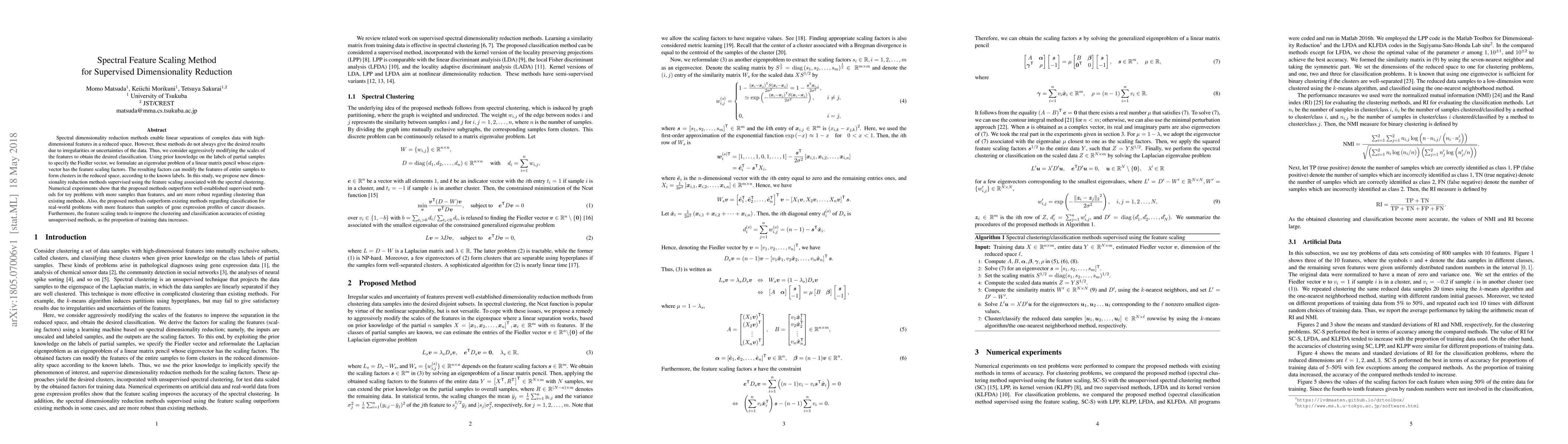 This paper proposes a supervised dimensionality reduction method that scales spectral features to enhance classification performance. The method uses feature scaling factors derived from a Fiedler vector and outperforms existing supervised and unsupervised methods in both toy and real-world datasets, particularly in gene expression profiling.
