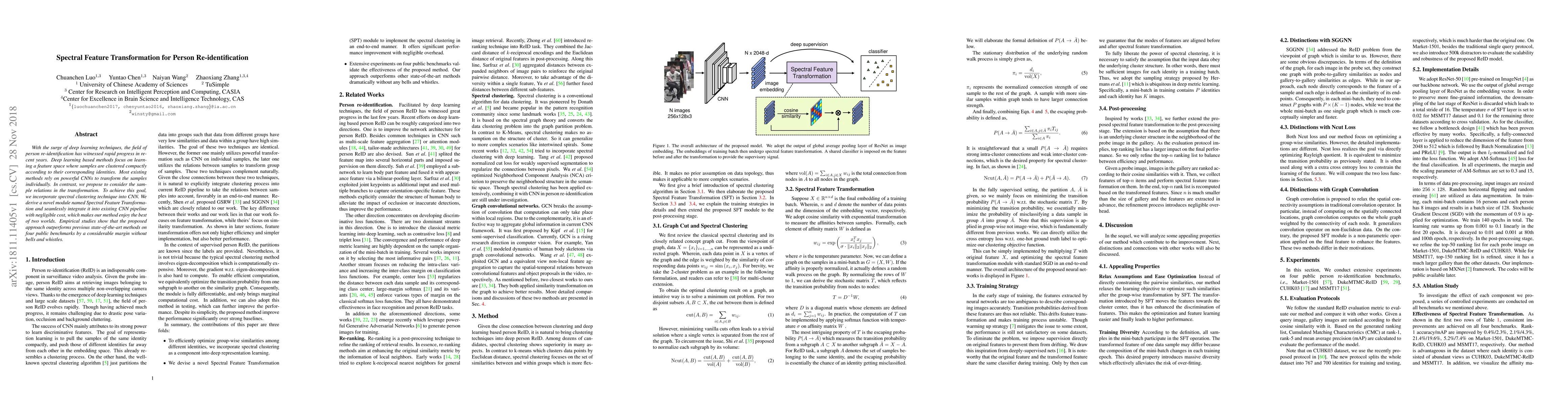 With the surge of deep learning techniques, the field of person re-identification has witnessed rapid progress in recent years. Deep learning based methods focus on learning a feature space where samples are clustered compactly according to their corresponding identities. Most existing methods rely on powerful CNNs to transform the samples individually. In contrast, we propose to consider the sample relations in the transformation. To achieve this goal, we incorporate spectral clustering technique into CNN. We derive a novel module named Spectral Feature Transformation and seamlessly integrate it into existing CNN pipeline with negligible cost,which makes our method enjoy the best of two worlds. Empirical studies show that the proposed approach outperforms previous state-of-the-art methods on four public benchmarks by a considerable margin without bells and whistles.