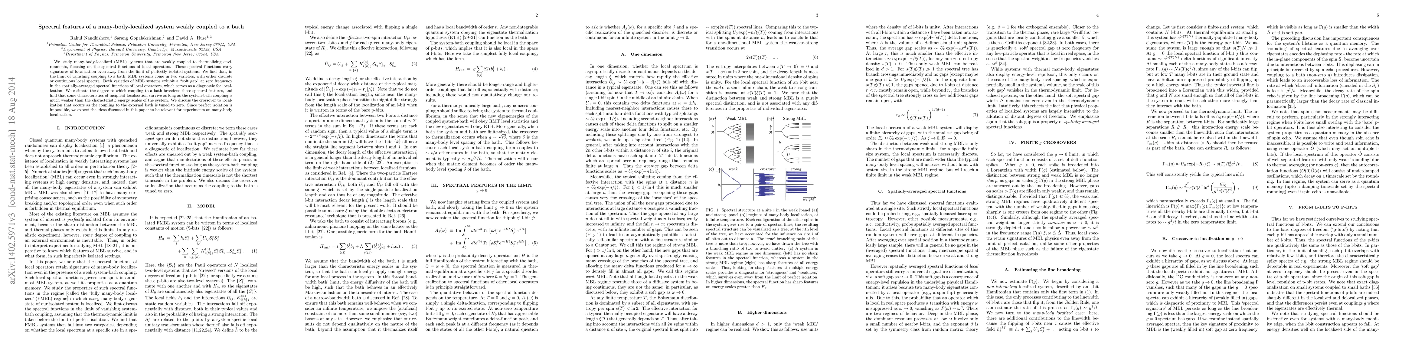 This paper investigates the spectral features of many-body localized systems weakly coupled to thermal environments, revealing that localization signatures persist even with minimal coupling. The study identifies two types of MBL systems with distinct local spectra and highlights a "soft gap" as a diagnostic for localization, which remains evident when system-bath coupling is weak compared to system energy scales.