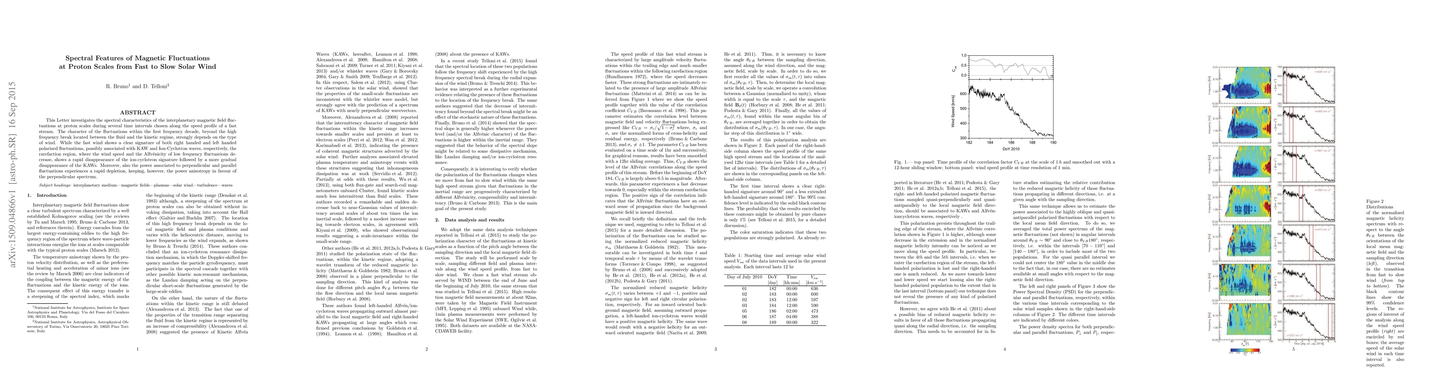 The study explores magnetic fluctuations in solar wind at proton scales, revealing that fast wind shows clear signs of ion-cyclotron waves and kinetic Alfvænic waves, while slow wind features a depletion of these signatures.