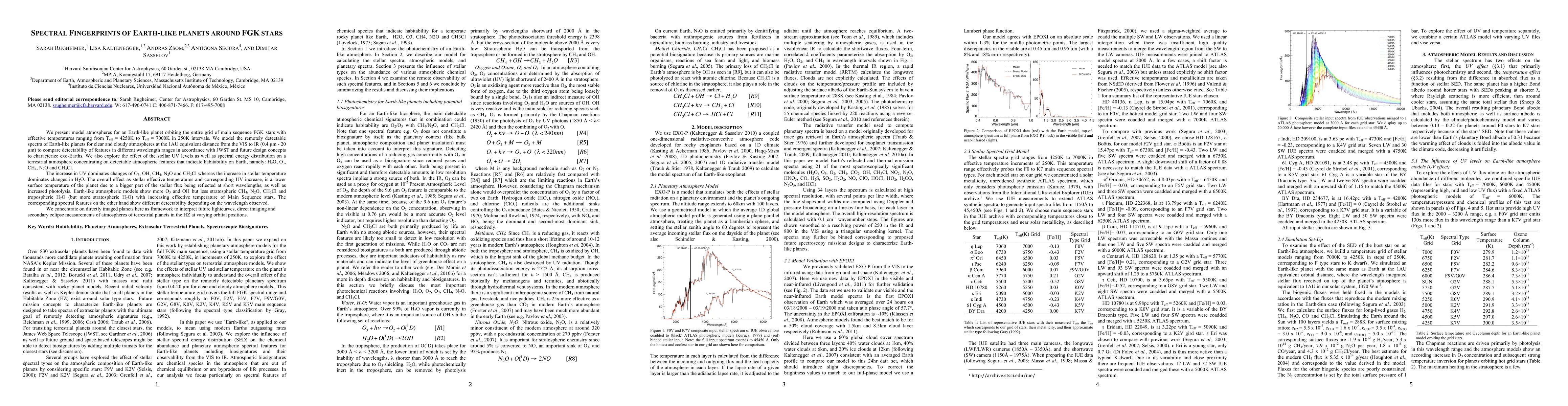 This paper models the atmospheres of Earth-like planets orbiting FGK stars, focusing on spectral features detectable by JWST and future telescopes. It finds that increased stellar UV and temperature affect atmospheric gases, with implications for habitability indicators like H2O and O3, and highlights the varying detectability of these features across different wavelengths.