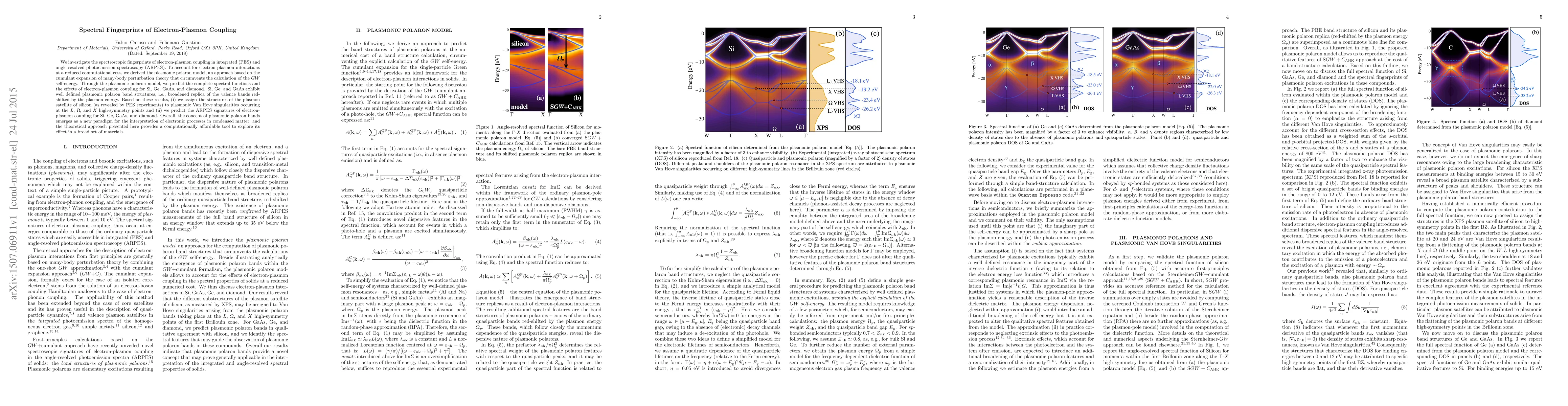 This paper investigates electron-plasmon coupling using integrated and angle-resolved photoemission spectroscopy, introducing the plasmonic polaron model to predict spectral functions. It reveals well-defined plasmonic polaron band structures in Si, Ge, GaAs, and diamond, and assigns the plasmon satellite structures in silicon to plasmonic Van Hove singularities.