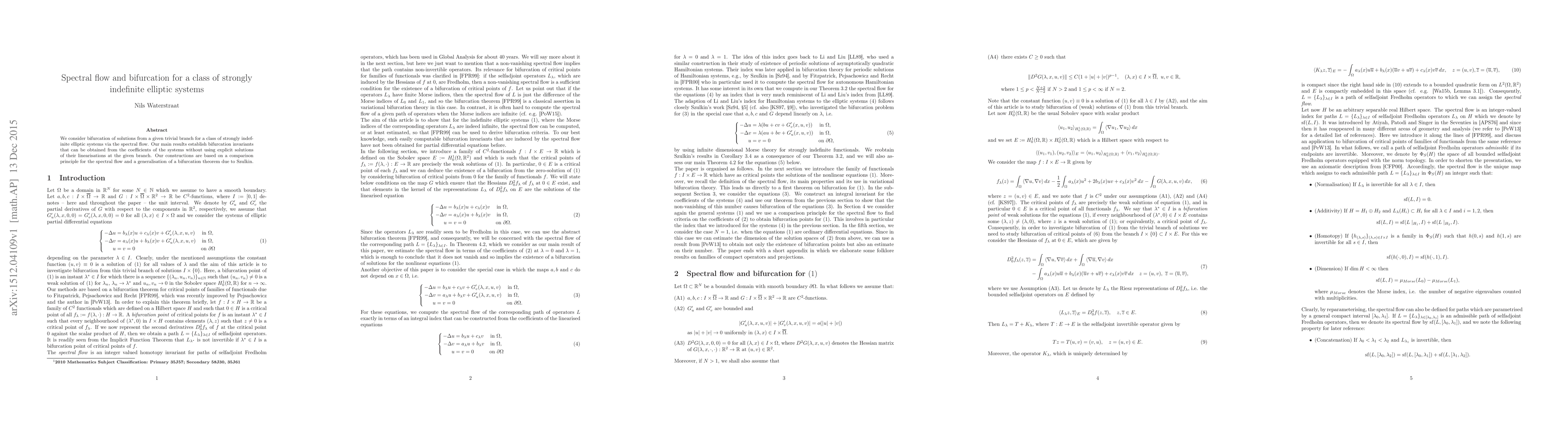 This paper investigates bifurcations in strongly indefinite elliptic systems using spectral flow, establishing invariants from system coefficients without solving their linearizations. It leverages a comparison principle for spectral flow and generalizes a bifurcation theorem by Szulkin.