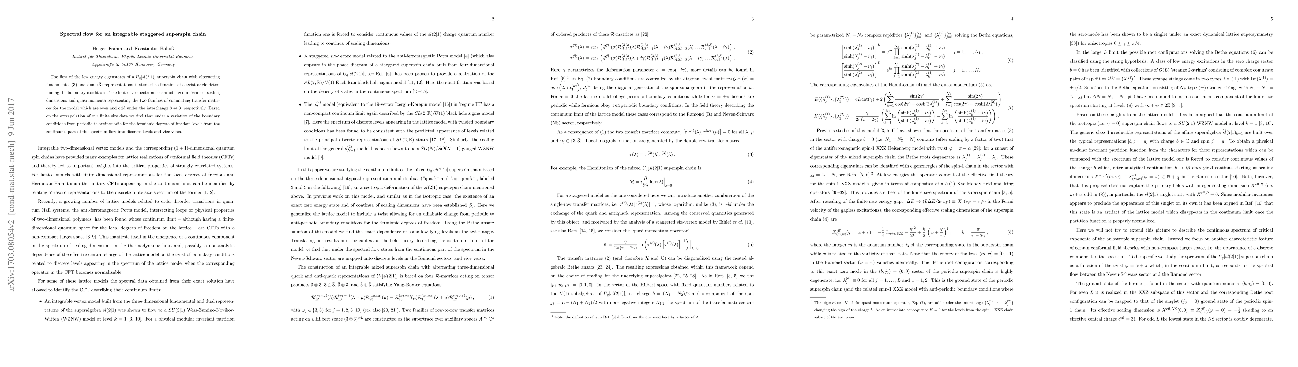 The flow of the low energy eigenstates of a $U_q[sl(2|1)]$ superspin chain with alternating fundamental ($3$) and dual ($\bar{3}$) representations is studied as function of a twist angle determining the boundary conditions. The finite size spectrum is characterized in terms of scaling dimensions and quasi momenta representing the two families of commuting transfer matrices for the model which are even and odd under the interchange $3\leftrightarrow \bar{3}$, respectively. Based on the extrapolation of our finite size data we find that under a variation of the boundary conditions from periodic to antiperiodic for the fermionic degrees of freedom levels from the continuous part of the spectrum flow into discrete levels and vice versa.