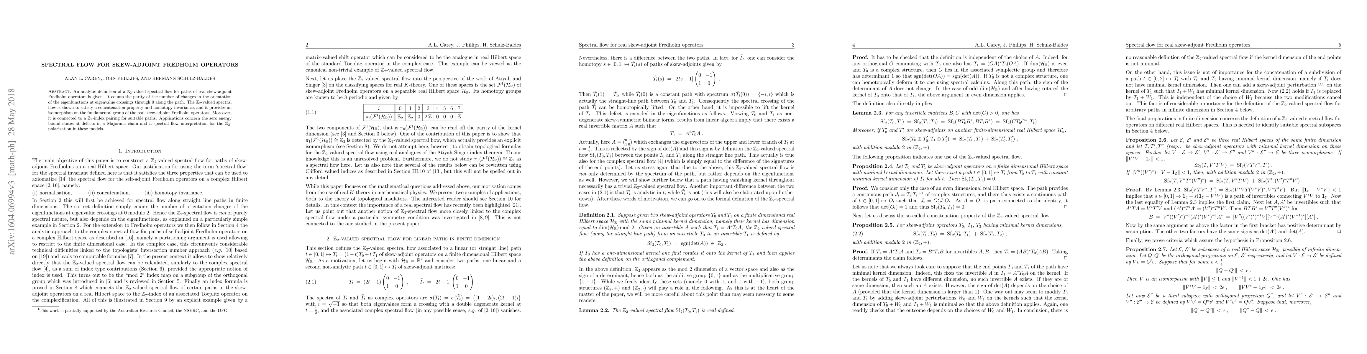 This paper defines a $\mathbb{Z}_2$-valued spectral flow for real skew-adjoint Fredholm operators, which counts the parity of eigenvalue crossings through $0$. It establishes properties like concatenation and homotopy invariance, and links it to $\mathbb{Z}_2$-index pairings, with applications to Majorana chains and $\mathbb{Z}_2$-polarization.