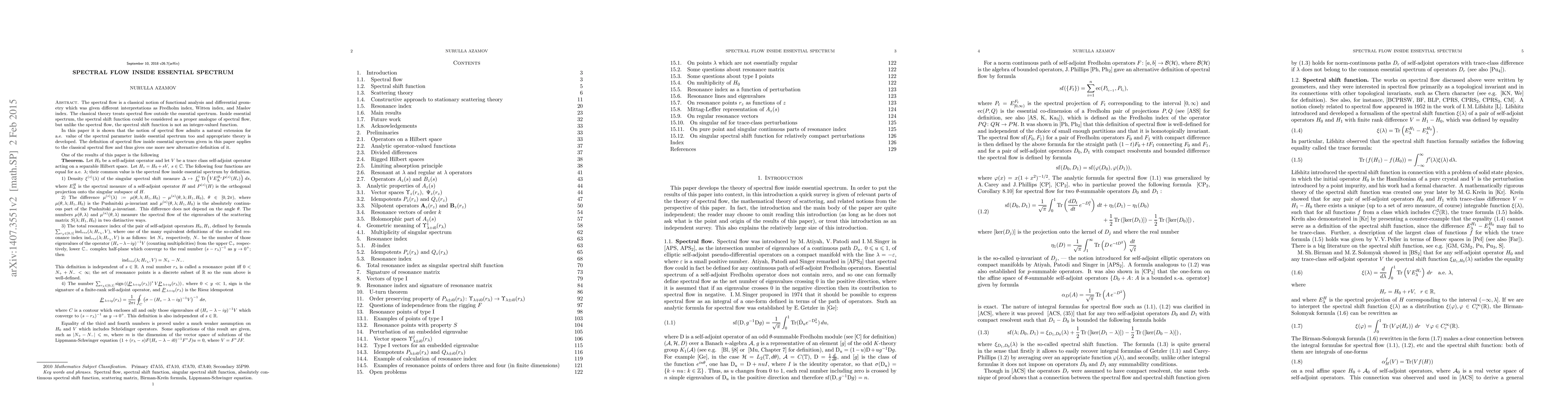 The spectral flow is a classical notion of functional analysis and differential geometry which was given different interpretations as Fredholm index, Witten index, and Maslov index. The classical theory treats spectral flow outside the essential spectrum. Inside essential spectrum, the spectral shift function could be considered as a proper analogue of spectral flow, but unlike the spectral flow, the spectral shift function is not an integer-valued function. In this paper it is shown that the notion of spectral flow admits a natural integer-valued extension for a.e. value of the spectral parameter inside essential spectrum too and appropriate theory is developed. The definition of spectral flow inside essential spectrum given in this paper applies to the classical spectral flow and thus gives one more new alternative definition of it.