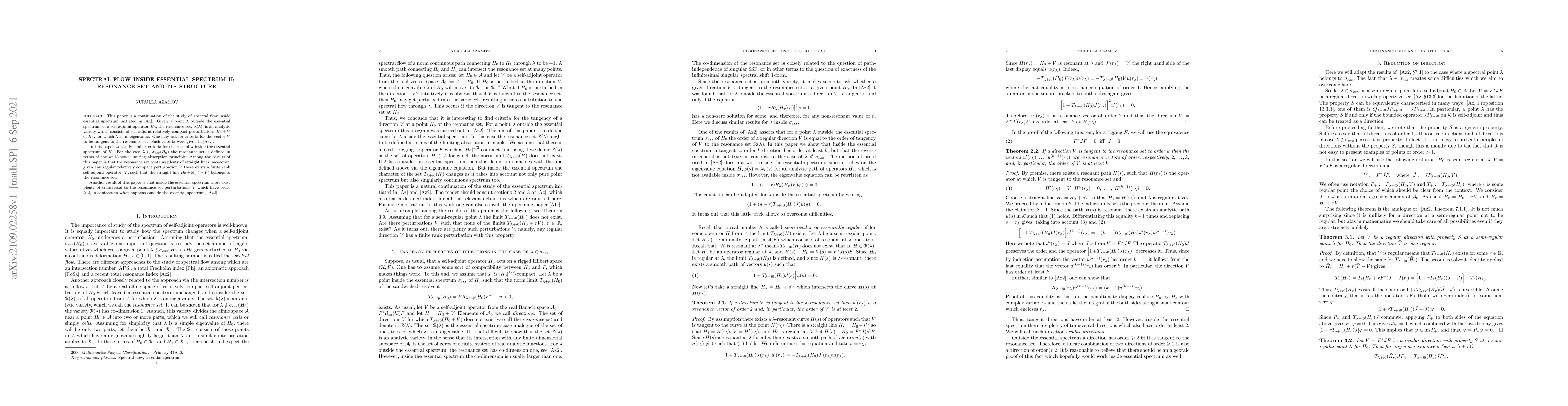 This paper is a continuation of the study of spectral flow inside essential spectrum initiated in \cite{AzSFIES}. Given a point $\lambda$ outside the essential spectrum of a self-adjoint operator $H_0,$ the resonance set, $\mathcal R(\lambda),$ is an analytic variety which consists of self-adjoint relatively compact perturbations $H_0+V$ of $H_0,$ for which $\lambda$ is an eigenvalue. One may ask for criteria for the vector $V$ to be tangent to the resonance set. Such criteria were given in \cite{AzSFnRI}. In this paper we study similar criteria for the case of $\lambda$ inside the essential spectrum of $H_0.$ For the case $\lambda \in \sigma_{ess}(H_0)$ the resonance set is defined in terms of the well-known limiting absorption principle. Among the results of this paper is that the resonance set contains plenty of straight lines, moreover, given any regular relatively compact perturbation $V$ there exists a finite rank self-adjoint operator, $\tilde V,$ such that the straight line $H_0 + \mathbb R(V-\tilde V)$ belongs to the resonance set. Another result of this paper is that inside the essential spectrum there exist plenty of transversal to the resonance set perturbations $V$ which have order $\geq 2,$ in contrast to what happens outside the essential spectrum, \cite{AzSFnRI}.