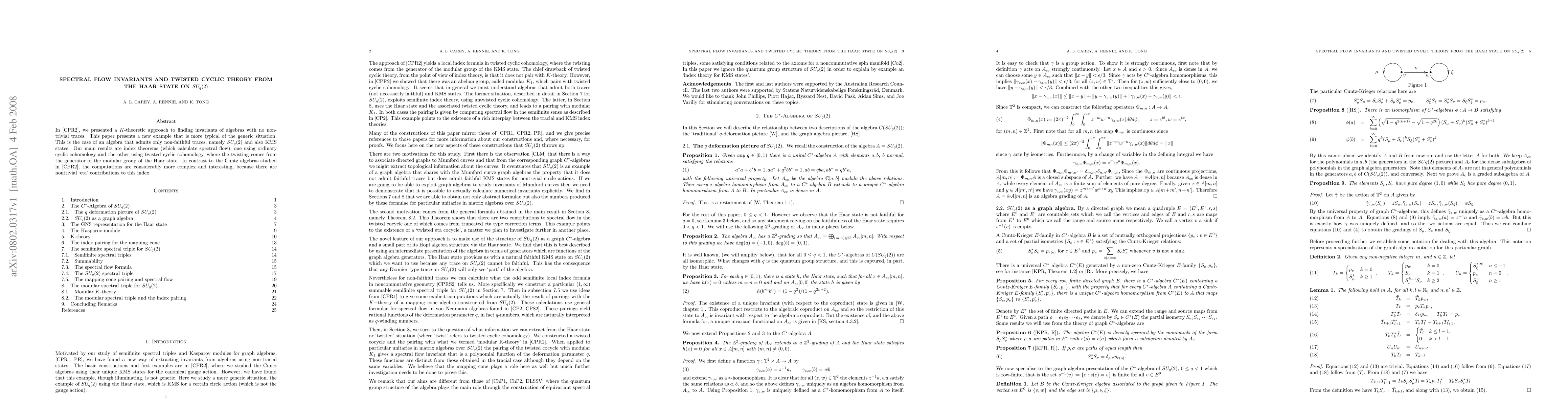 This paper explores spectral flow invariants and twisted cyclic theory for the algebra SU_q(2), which admits only non-faithful traces and KMS states. It presents index theorems using ordinary and twisted cyclic cohomology, revealing nontrivial 'eta' contributions that complicate but enrich the computations compared to previous studies on Cuntz algebras.