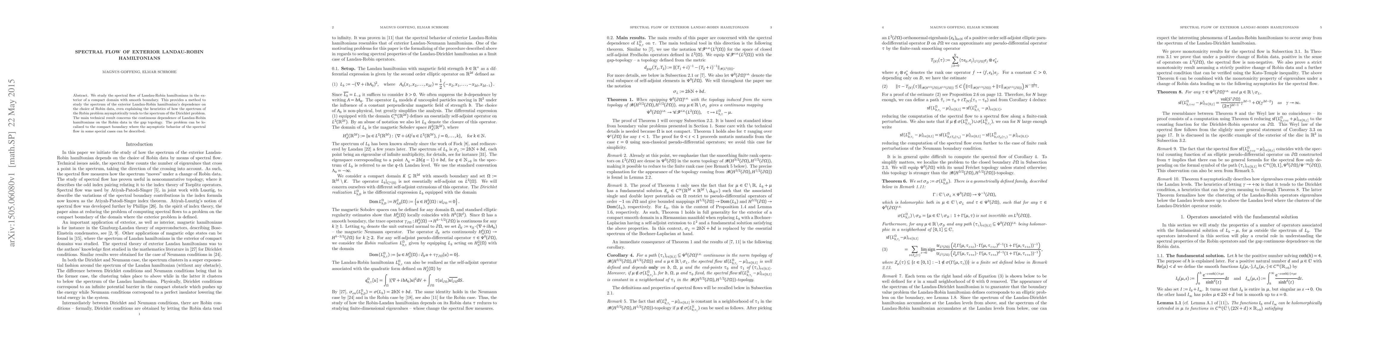 We study the spectral flow of Landau-Robin hamiltonians in the exterior of a compact domain with smooth boundary. This provides a method to study the spectrum of the exterior Landau-Robin hamiltonian's dependence on the choice of Robin data, even explaining the heuristics of how the spectrum of the Robin problem asymptotically tends to the spectrum of the Dirichlet problem. The main technical result concerns the continuous dependence of Landau-Robin hamiltonians on the Robin data in the gap topology. The problem can be localized to the compact boundary where the asymptotic behavior of the spectral flow in some special cases can be described.