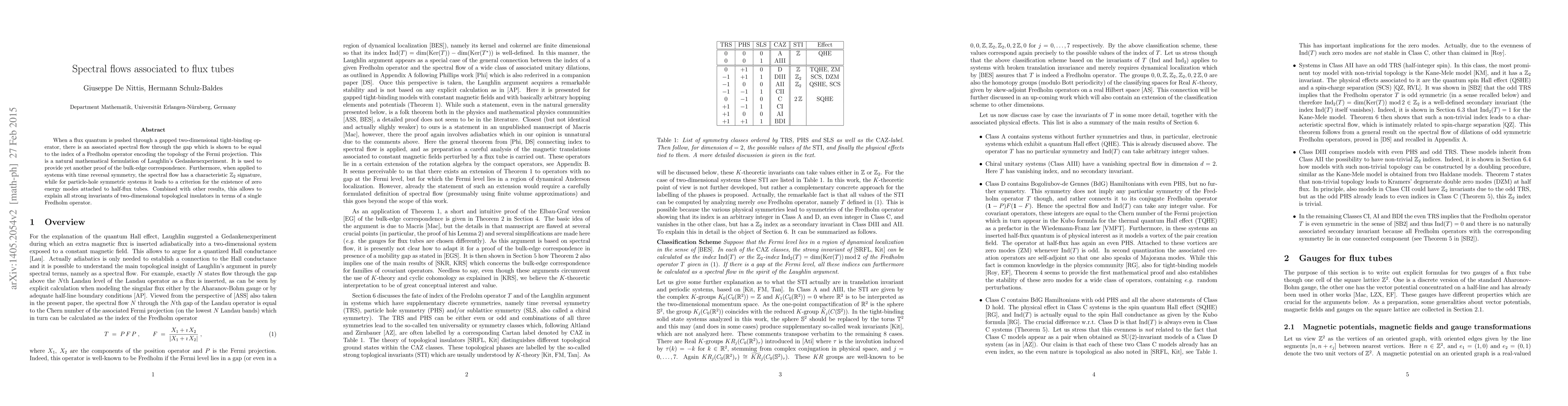 When a flux quantum is pushed through a gapped two-dimensional tight-binding operator, there is an associated spectral flow through the gap which is shown to be equal to the index of a Fredholm operator encoding the topology of the Fermi projection. This is a natural mathematical formulation of Laughlin's Gedankenexperiment. It is used to provide yet another proof of the bulk-edge correspondence. Furthermore, when applied to systems with time reversal symmetry, the spectral flow has a characteristic $Z_2$ signature, while for particle-hole symmetric systems it leads to a criterion for the existence of zero energy modes attached to half-flux tubes. Combined with other results, this allows to explain all strong invariants of two-dimensional topological insulators in terms of a single Fredholm operator.