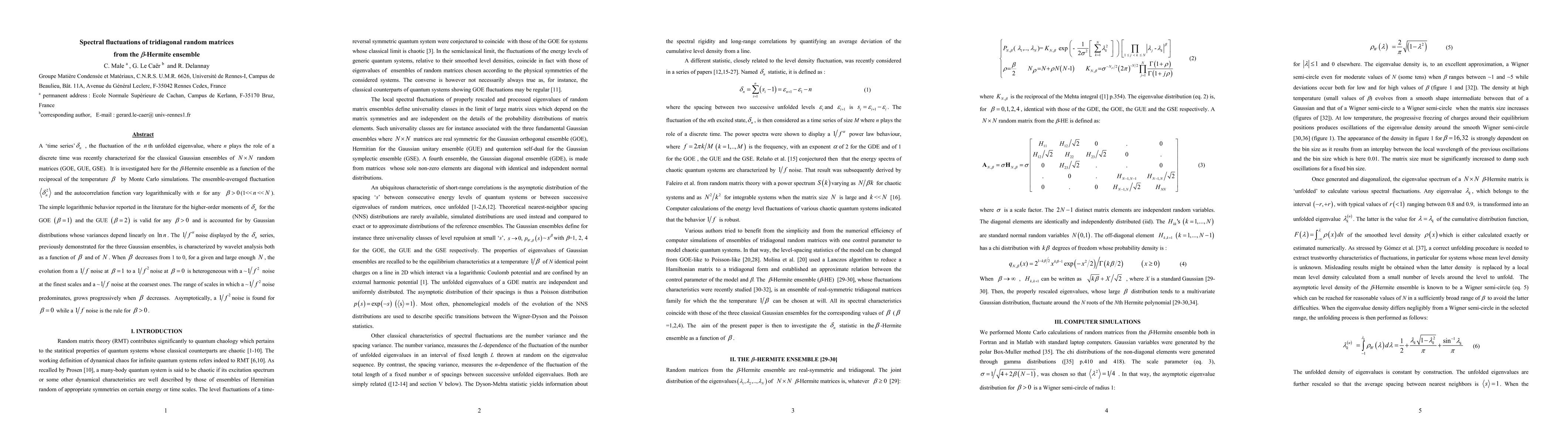 This paper investigates the spectral fluctuations of tridiagonal random matrices in the beta-Hermite ensemble using Monte Carlo simulations, finding that fluctuations and autocorrelation functions vary logarithmically with n for beta > 0. It reveals that the 1/f noise observed in classical Gaussian ensembles persists for any positive beta, transitioning to a 1/f^2 noise as beta decreases to zero.