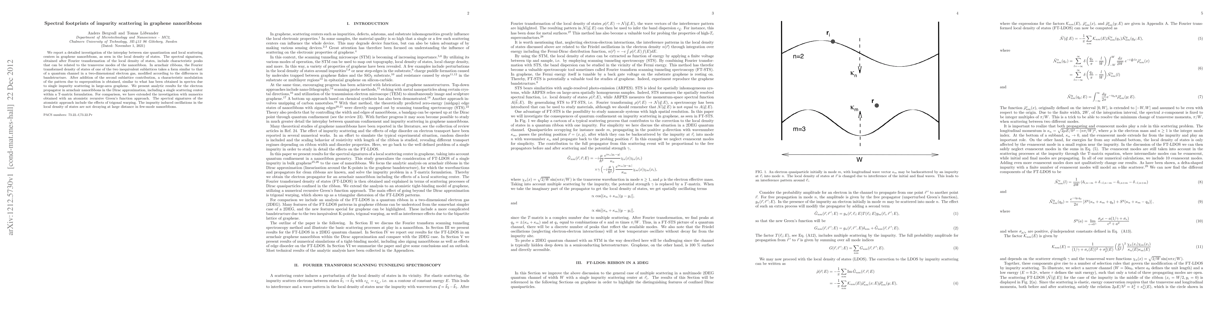 This paper investigates the spectral signatures of impurity scattering in graphene nanoribbons, revealing characteristic peaks linked to transverse modes. The study combines analytical results from the Dirac approximation and numerical simulations to show persistent impurity-induced oscillations in the local density of states, particularly in few-mode nanoribbons.