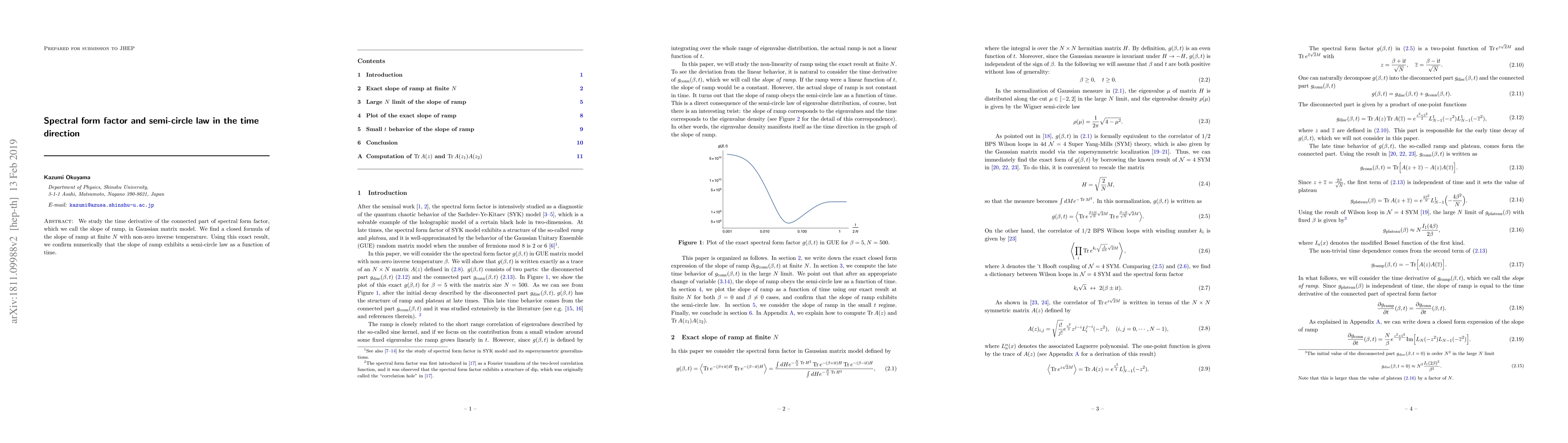 Researchers found a closed formula for the slope of ramp in Gaussian matrix model at finite N with non-zero inverse temperature, confirming a semi-circle law as a function of time through numerical simulation.