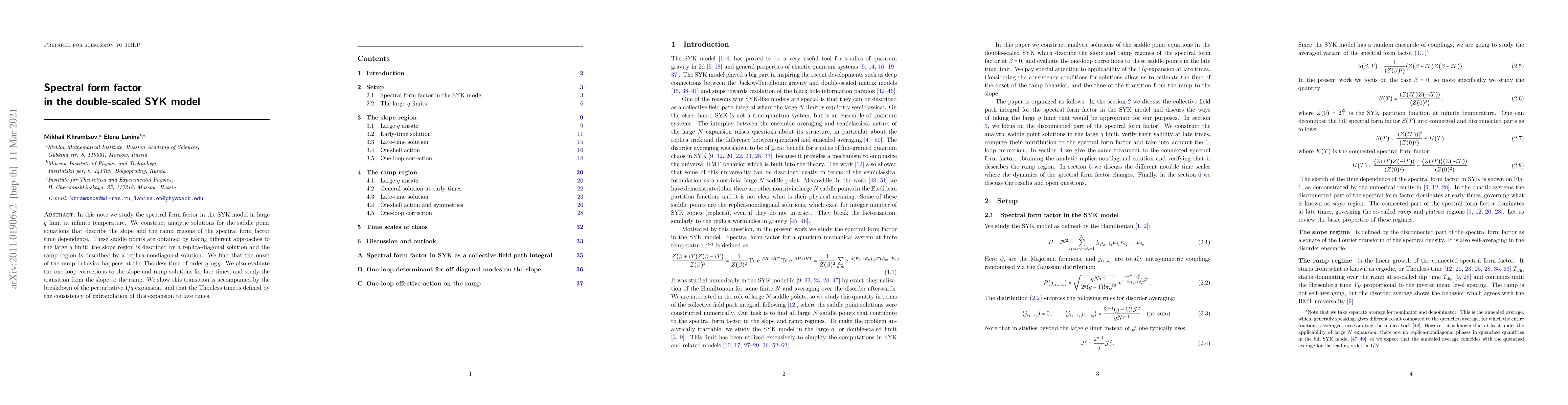 The paper presents detailed analytic solutions for the spectral form factor in the SYK model, extending previous work to late times and identifying the Thouless time as a critical scale.