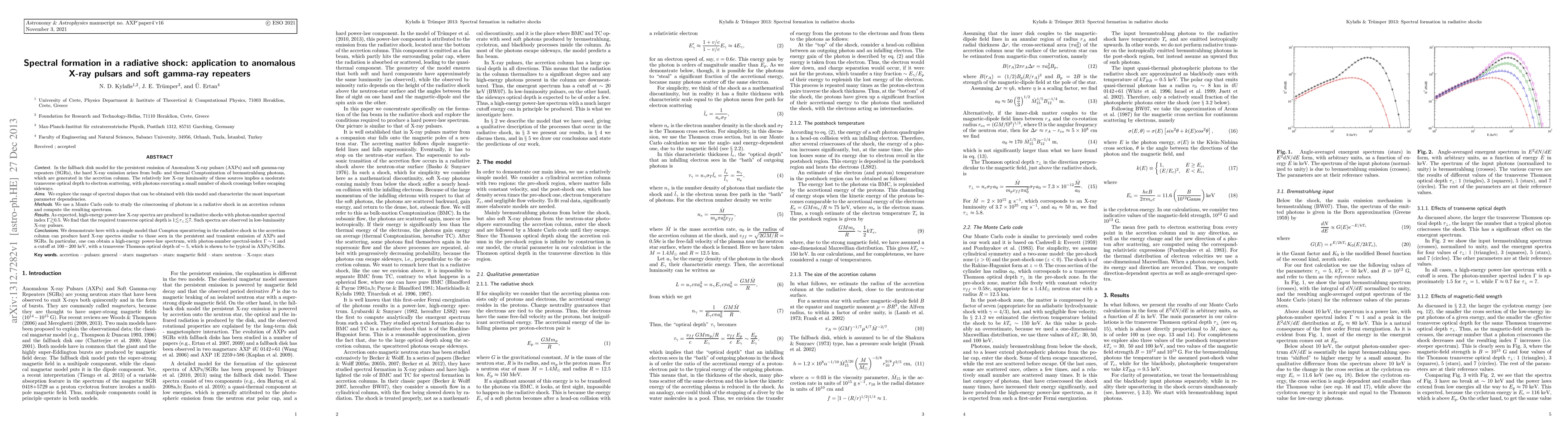 In the fallback disk model for the persistent emission of Anomalous X-ray pulsars (AXPs) and soft gamma-ray repeaters (SGRs), the hard X-ray emission arises from bulk- and thermal Comptonization of bremsstrahlung photons, which are generated in the accretion column. The relatively low X-ray luminosity of these sources implies a moderate transverse optical depth to electron scattering, with photons executing a small number of shock crossings before escaping sideways. We explore the range of spectral shapes that can be obtained with this model and characterize the most important parameter dependencies. We use a Monte Carlo code to study the crisscrossing of photons in a radiative shock in an accretion column and compute the resulting spectrum. As expected, high-energy power-law X-ray spectra are produced in radiative shocks with photon-number spectral index larger than or about 0.5. We find that the required transverse optical depth is between 1 and 7. Such spectra are observed in low-luminosity X-ray pulsars. We demonstrate here with a simple model that Compton upscattering in the radiative shock in the accretion column can produce hard X-ray spectra similar to those seen in the persistent and transient emission of AXPs and SGRs. In particular, one can obtain a high-energy power-law spectrum, with photon-number spectral index ~ 1 and a cutoff at 100 - 200 keV, with a transverse Thomson optical depth of ~ 5, which is shown to be typical in AXPs/SGRs.