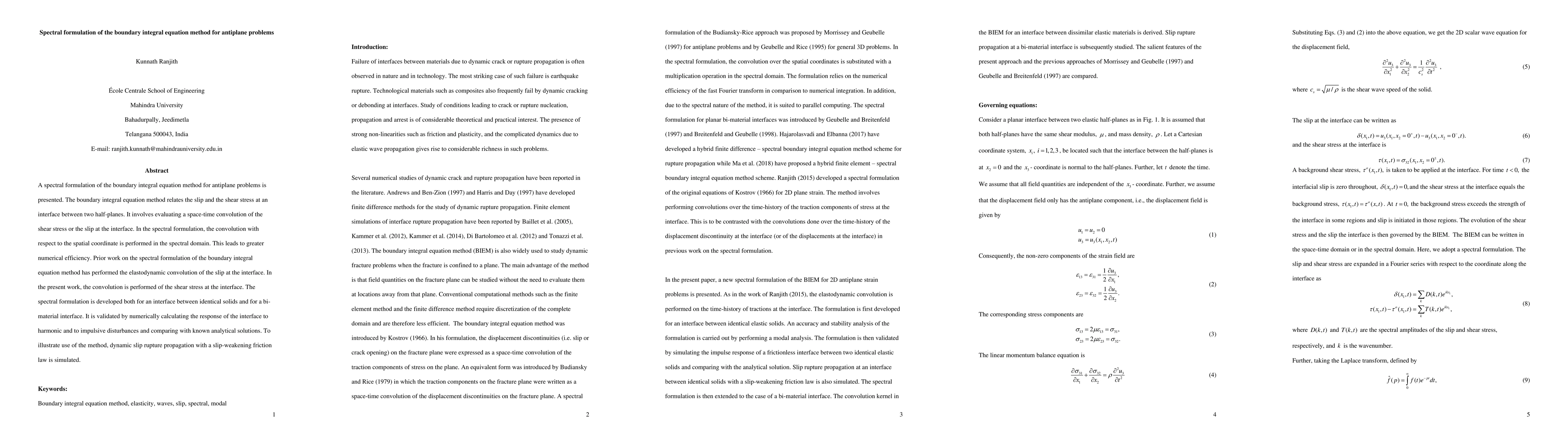 This paper presents a spectral formulation of the boundary integral equation method for antiplane problems, focusing on the convolution of shear stress at the interface for greater numerical efficiency. The method is validated through simulations of dynamic slip rupture propagation with a slip-weakening friction law.