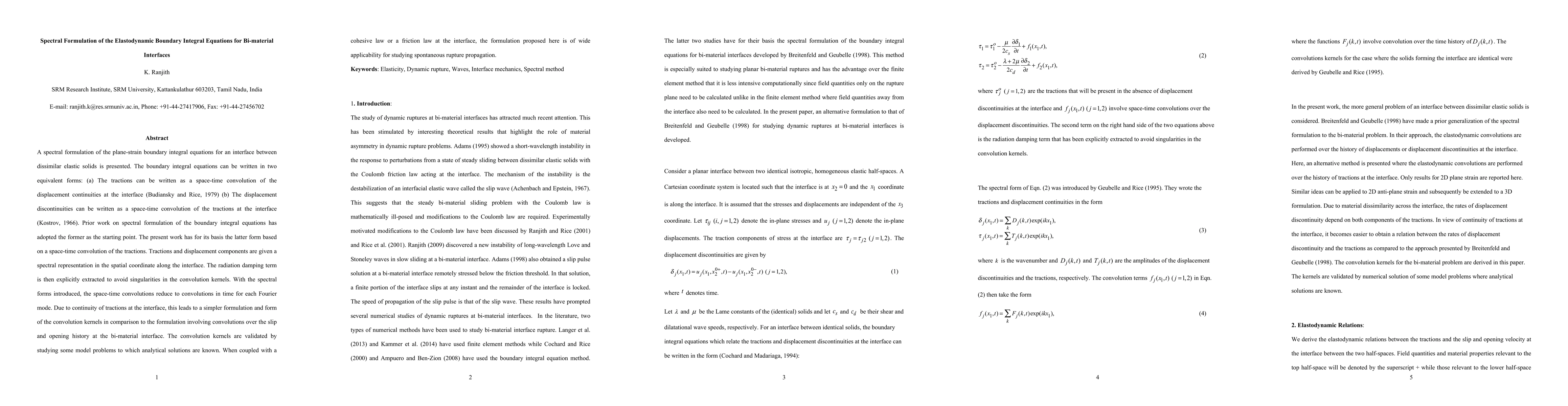 This paper presents a spectral formulation for boundary integral equations governing the interface between two dissimilar elastic solids. It introduces a novel approach based on the space-time convolution of tractions, simplifying the convolution kernels and avoiding singularities, which is validated through model problems with known analytical solutions. The method is applicable for studying spontaneous rupture propagation when coupled with cohesive or friction laws.