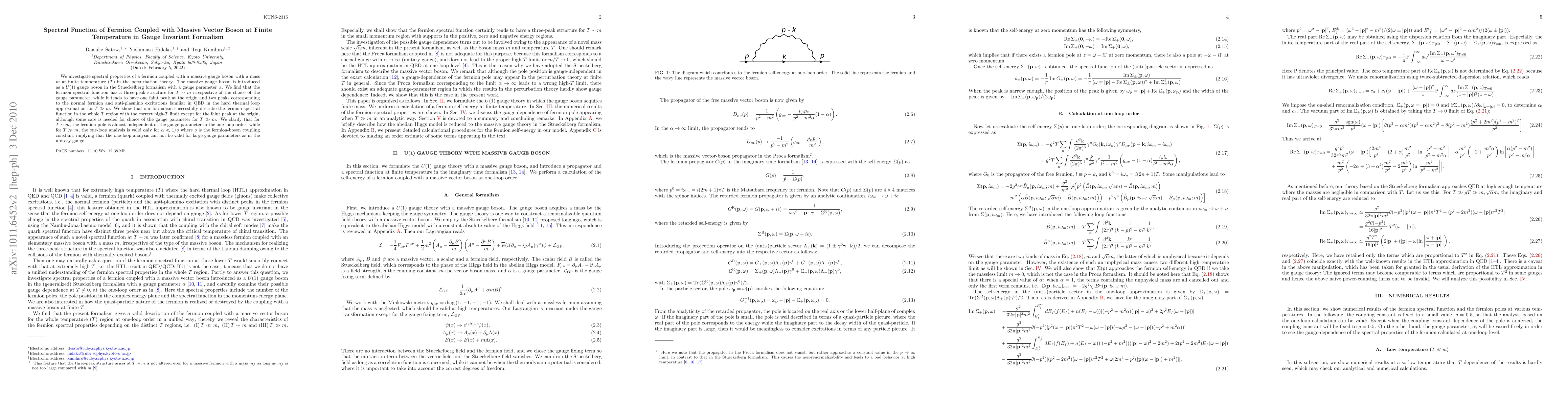 This paper studies the spectral function of fermions coupled with massive gauge bosons at finite temperature using perturbation theory. It reveals a three-peak structure for temperatures near the boson mass, transitioning to a single peak and two familiar peaks at higher temperatures, while emphasizing the importance of gauge parameter choice for accurate results.