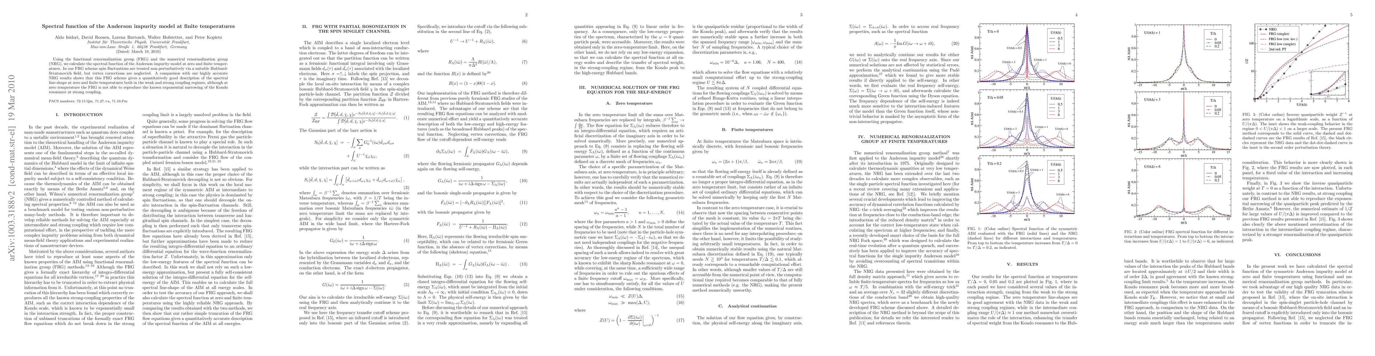 The paper calculates the spectral function of the Anderson impurity model at various temperatures using FRG and NRG methods, showing that FRG provides a good quantitative description of the spectral line-shape, except for the exponential narrowing of the Kondo resonance at zero temperature.