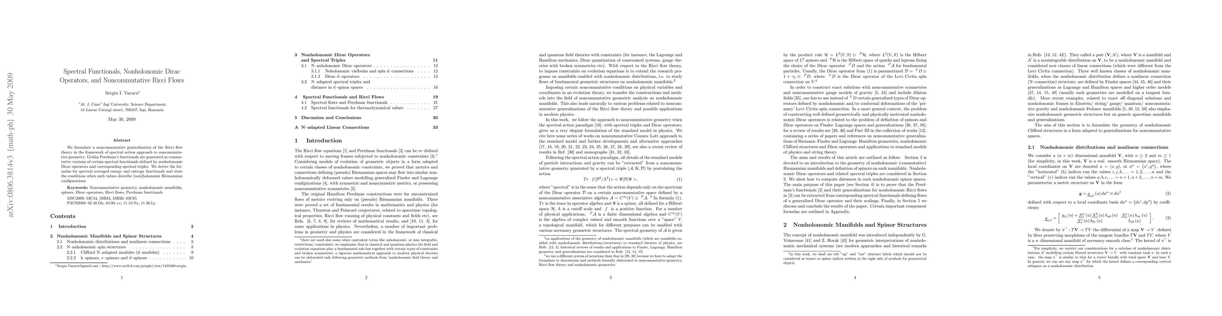 We formulate a noncommutative generalization of the Ricci flow theory in the framework of spectral action approach to noncommutative geometry. Grisha Perelman's functionals are generated as commutative versions of certain spectral functionals defined by nonholonomic Dirac operators and corresponding spectral triples. We derive the formulas for spectral averaged energy and entropy functionals and state the conditions when such values describe (non)holonomic Riemannian configurations.