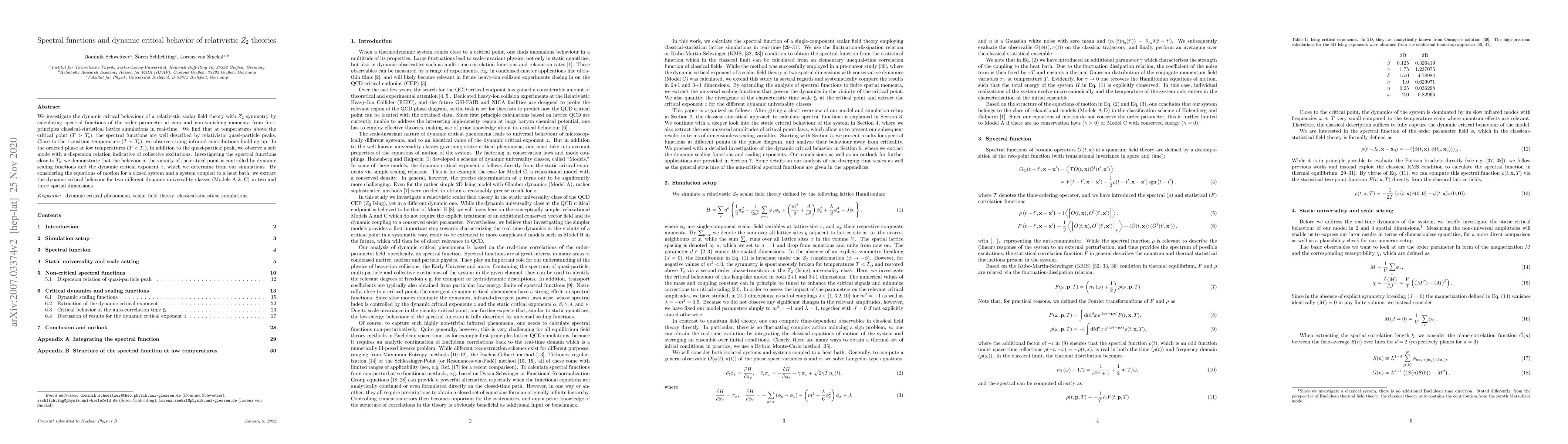 We investigate the dynamic critical behaviour of a relativistic scalar field theory with $Z_2$ symmetry by calculating spectral functions of the order parameter at zero and non-vanishing momenta from first-principles classical-statistical lattice simulations in real-time. We find that at temperatures above the critical point $(T > T_c)$, the spectral functions are well described by relativistic quasi-particle peaks. Close to the transition temperature $(T \sim T_c)$, we observe strong infrared contributions building up. In the ordered phase at low temperatures $(T < T_c)$, in addition to the quasi-particle peak, we observe a soft mode with a dispersion relation indicative of collective excitations. Investigating the spectral functions close to $T_c$, we demonstrate that the behavior in the vicinity of the critical point is controlled by dynamic scaling functions and the dynamic critical exponent $z$, which we determine from our simulations. By considering the equations of motion for a closed system and a system coupled to a heat bath, we extract the dynamic critical behavior for two different dynamic universality classes (Models A & C) in two and three spatial dimensions.
