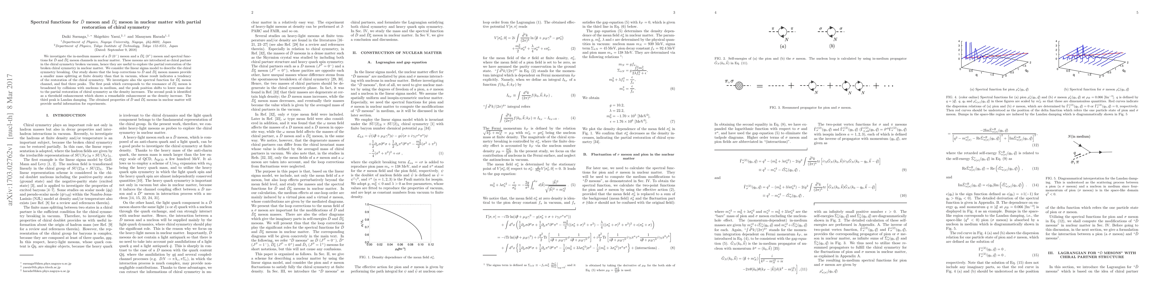 This paper investigates the in-medium masses and spectral functions of $\bar{D}$ and $\bar{D}_0^*$ mesons in nuclear matter, using the linear sigma model to explore the partial restoration of chiral symmetry. Results show a smaller mass splitting at finite density, indicating chiral symmetry restoration, and identify three peaks in the $\bar{D}_0^*$ meson spectral function, with shifts and broadening due to interactions in medium.