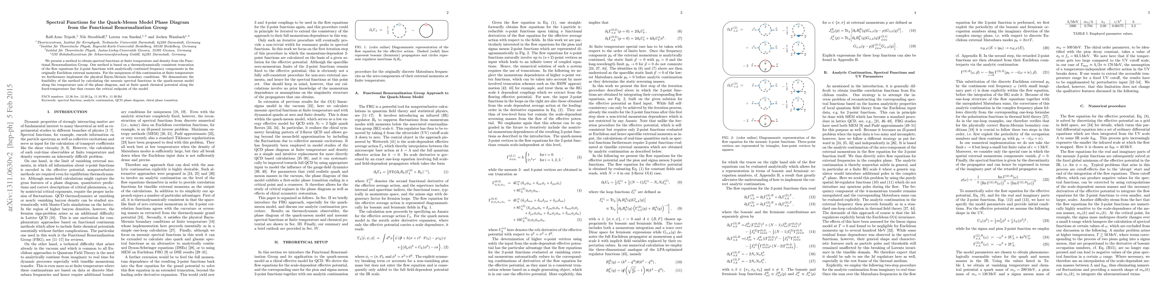 This paper introduces a Functional Renormalization Group method to derive spectral functions at finite temperature and density, applying thermodynamically consistent truncations and Baym-Mermin boundary conditions. The method is demonstrated through calculations of mesonic spectral functions in the quark-meson model, particularly along the temperature axis and at finite quark chemical potential near the critical endpoint.