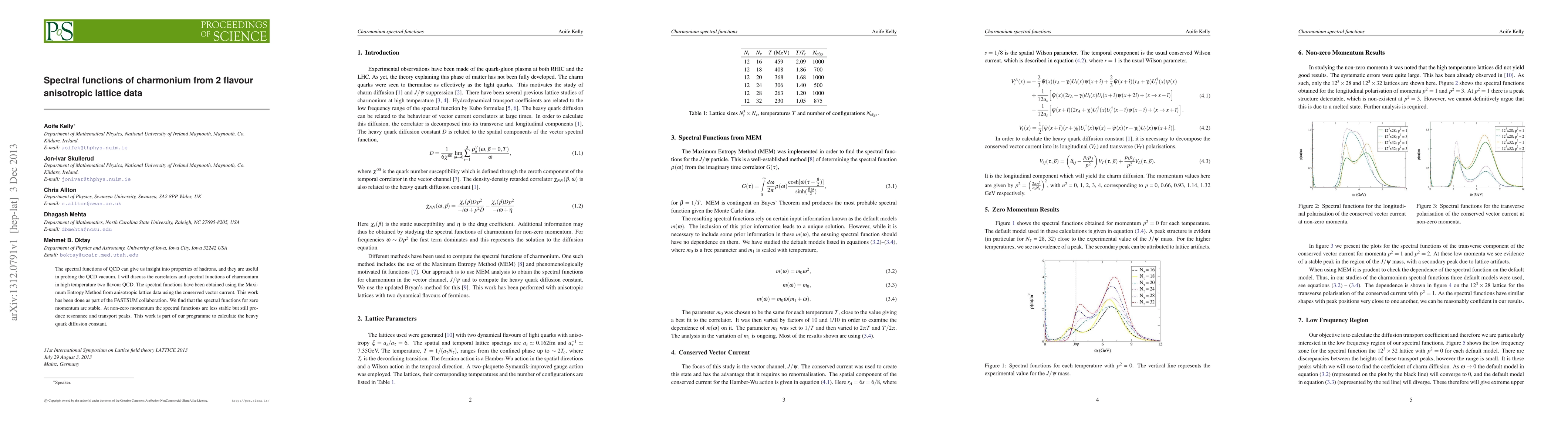 The research utilizes 2-flavor anisotropic lattice QCD with the conserved vector current to compute charmonium spectral functions, employing the Maximum Entropy Method (MEM) for analysis. Lattices have an anisotropy ξ=as/aτ=6, with spatial and temporal lattice spacings of a's' = 0.162 fm and a-1τ' = 7.35 GeV, respectively. Temperatures range from the confined phase up to ~2Tc, with the fermion action being a Hamber-Wu action in spatial directions and a Wilson action in the temporal direction.